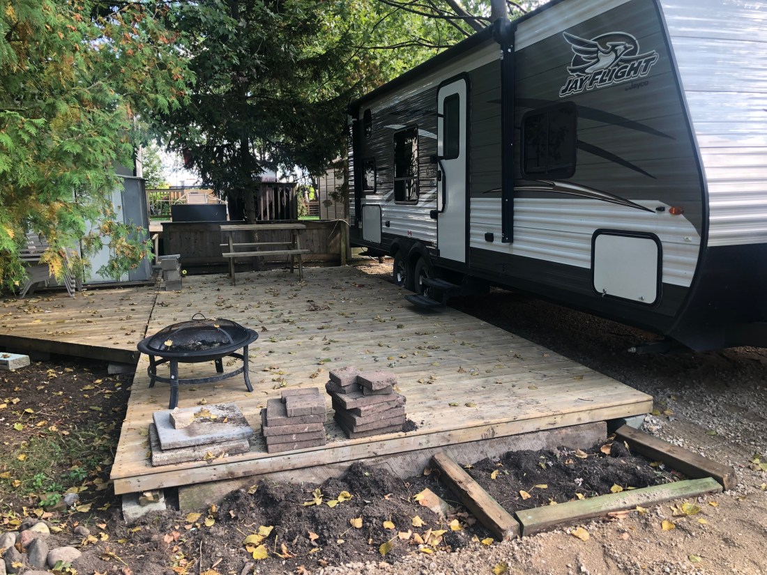 So this last weekend Bob and Irena spend time prepping their new site, levelling a deck, cleaning up debris, pruning overgrown trees, laying some gravel at the back of the site and planning a small garden. Then on Tuesday I gravelled the site and set their trailer next to the deck, so it’s official…welcome to Lake Huron Resort Bob, Irena, and Alex the proud new holders of site 167…for 2020.