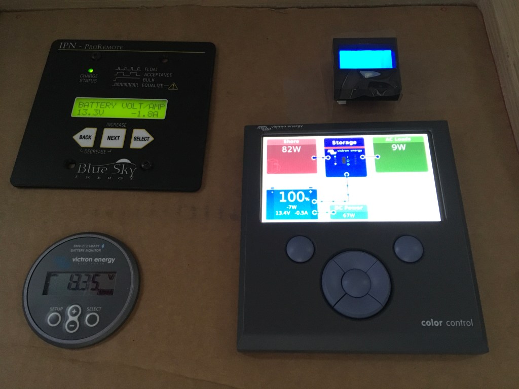 This will have all the controllers in the same area, as you can see from the photo they are just mounted on a piece of cardboard for now, just wanted a chance to make sure I was happy with the positioning before creating the actual mounting board. I plan on using grey smoked plexiglass for this, and while not real expensive will take a lot of work to cut and fit everything. The system is still not operational as I’m waiting for the 8 gauge wire that will connect the actual 120 volt power to the inverter, and supply the power back to the electrical breaker panel, but somehow USPS has somehow managed to send it Cave Creek Arizona from Phoenix instead of Ajo Arizona. But hopefully they will get it back on course so that I can get this task completed.