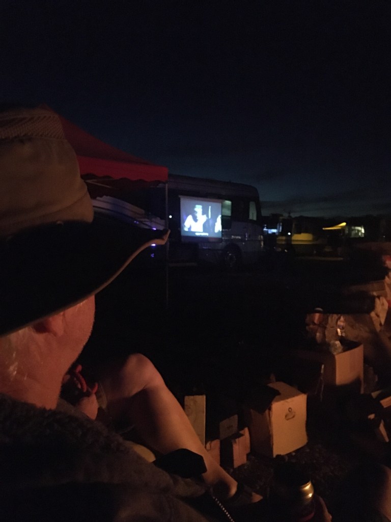 Day one of the rally is mainly just getting to meet our new neighbours, there was a period between one and three for the actual rally registration. And then from four till six was an evening of appetizers as everyone has brought tables and chairs to form an area where all our meals will be served. At dusk a couple of large campfires were starter, and a movie was shown fittingly – Robin Williams in The RV.