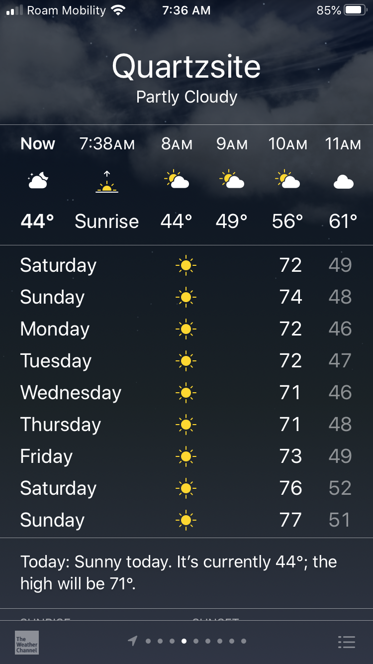 But as we check the forecast that is ahead for the next week, it becomes more obvious what the draws us to the ruggedness of the desert. As we watch the weather forecast in other parts of the country and the temperatures swing from ten degrees below average to ten degrees above average in just a matter of three or four days. And we certainly have had a few cool evenings that got close to the freezing point, but that normally only lasts for December through January as storms come in over the Pacific, then the temperatures start climbing back to that seventy degree range that is our target desired temperature.