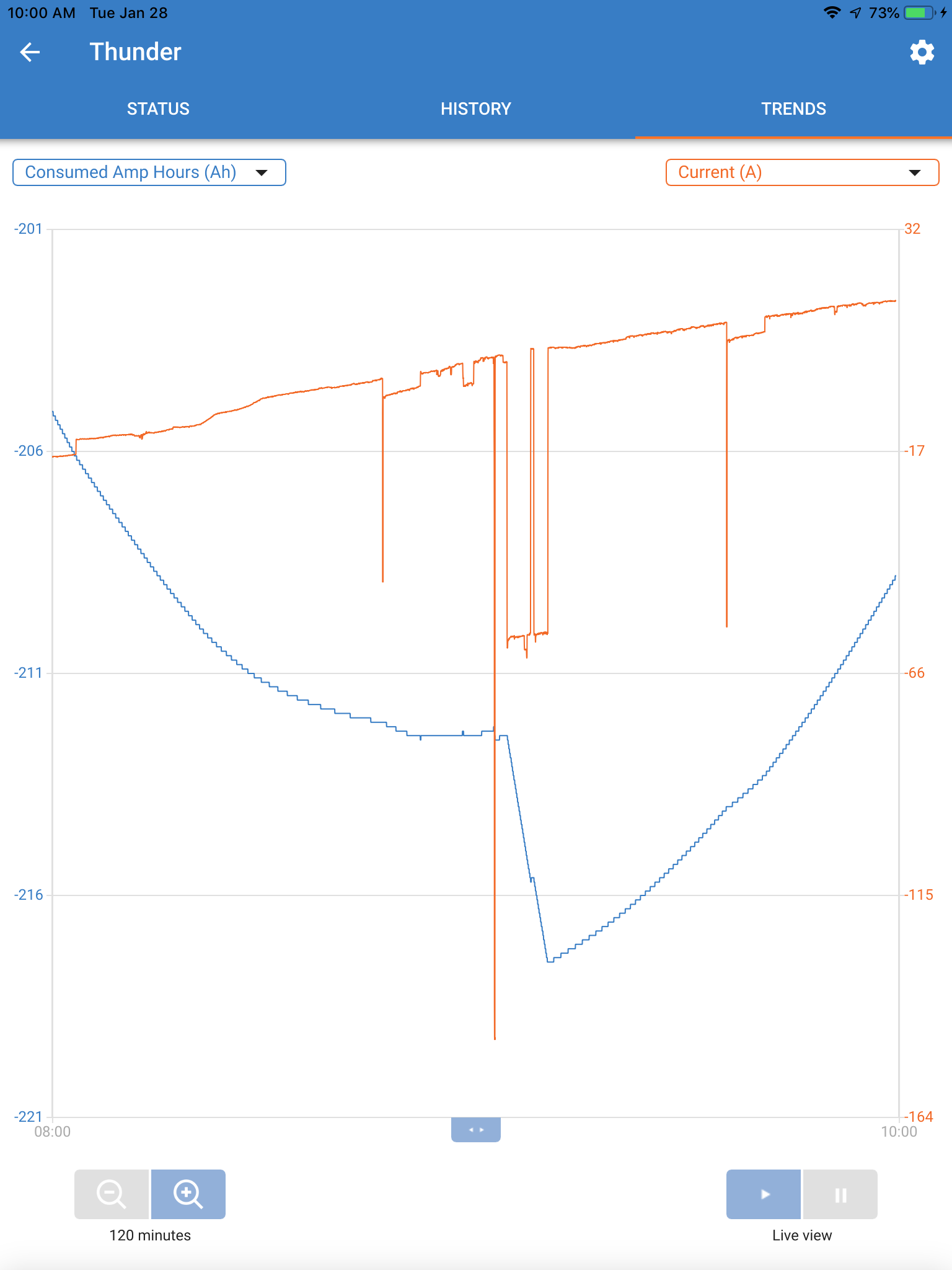 This is a snapshot of the same time on the 28th of January. The blue and brown show the same information. Generally very similar with the big difference being the blue line and the sharper uptick in the battery recharging. The scaling on the brown amperage line is different because of a short usage of the microwave (which is a large draw) to soften the butter…lol. The same refrigerator cycling, water pump, and of course our toast at about 9 o’clock. About the same time the solar stops the discharging of the batteries.