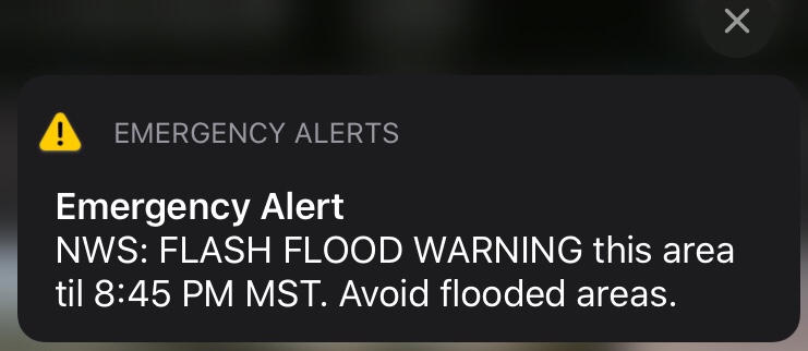 This picture was taken at around ten o’clock this morning, it was dry yesterday and it there was nothing flowing this afternoon. Then another storm rolled through and within an hour it was back flowing. I know it’s hard to tell the size from the photo, while not very deep only about a few inches it is at least six feet wide. While surrounded by mountains, we are not real close, we are on high ground three or four feet above the level of the wash, but it just comes in waves.
