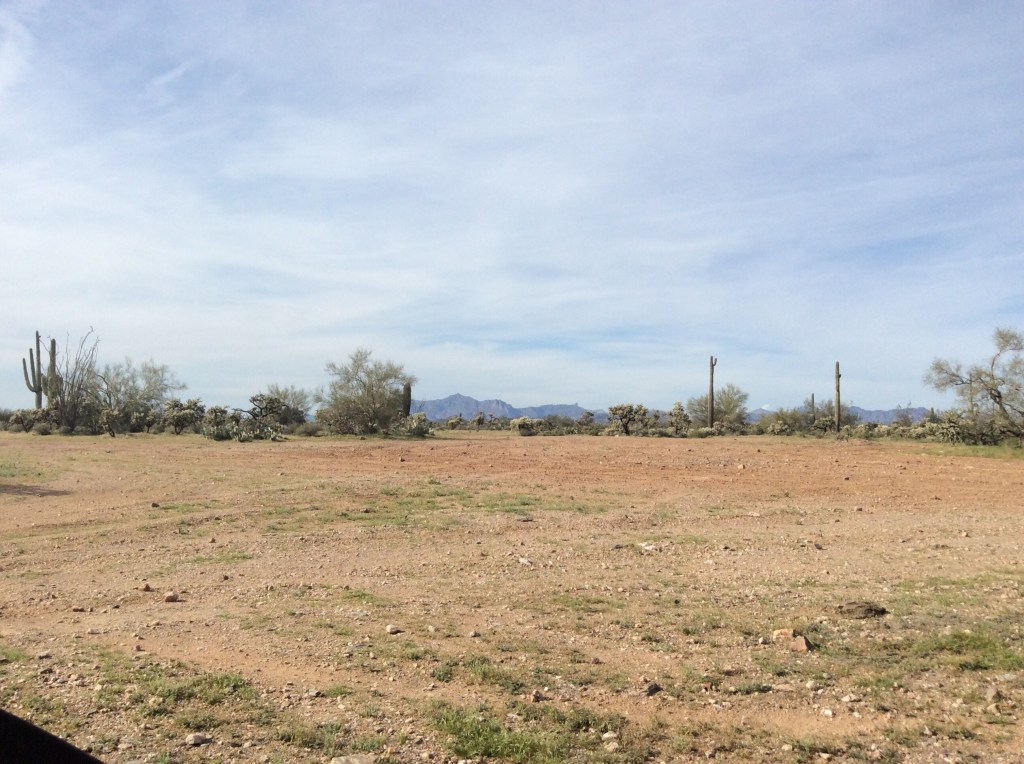 So now we will be scouting out some more areas today to see if there is a quieter area with just a few less red necks. And we found a spot about two miles further up the road and the view of the mountains is outstanding, still a few ATV buzzing around, about like Quartzsite, and haven’t had a dog running through our area all day. That mountain range is the superstitions mountains east of Phoenix, we will try to struggle through a couple of week here.
