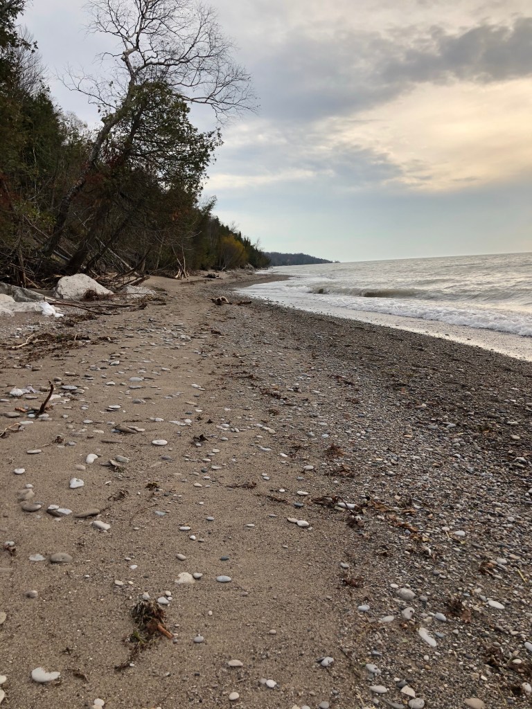 Well we spent a hour on the beach this afternoon, the only problem was that the beach was on the east shore of Lake Huron, usually by this time of year we would be on a beach in one of the southern States. But Miss Laurie did find some beach glass, and I enjoyed a craft beer from a Thunder Bay brewer, and all seemed well. The sky was overcast for the most part, but the temperature was 16ºC (61ºF), and for November that was quite warm, but with a 23 km/hr breeze from the south, it was cool enough that blue jeans and sweatshirts were required.