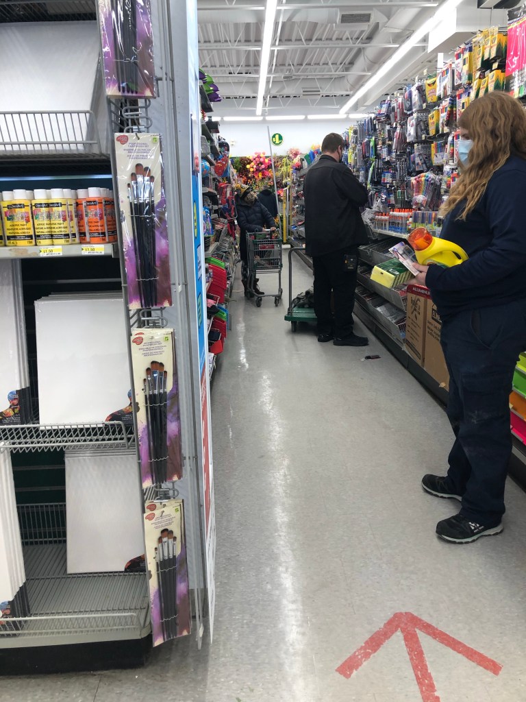 Unlike the farm supply stone that was more square footage and allowed only 5 customers, this dollar store with narrow isles is allowed 31, who the he!! made that decision? The farm store had an employee to control customers entering their store, the dollar store did not! And of course no one pays any attention to the direction arrows and that was the isle with the envelopes … just saying