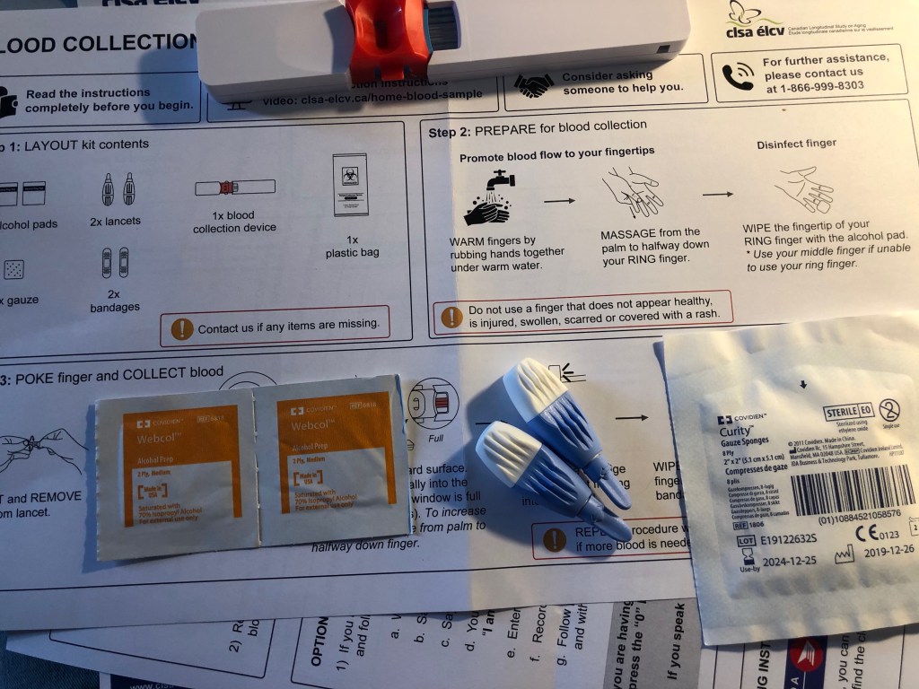 But apparently they are now working on collecting data, to see how Covid has effected us old farts, and they were asking to see if I would like to participate in a survey to check our blood for possible Covid antibodies, and to take blood samples both now and then again in three months, so I said sure (it’s not as if I’m too busy doing much of anything else) so about a week later FedEx dropped off a package with lots of neat things. To help extract enough blood to fill the supplied collection unit, so the kit came with a sheet of instructions, the sample collection unit, a couple of alcohol swabs, two band aids, a package of gauze, and a couple of sharp cutty things to puncture my finger. Along with a return envelope from FedEx to get the collection device back to a laboratory in Hamilton.