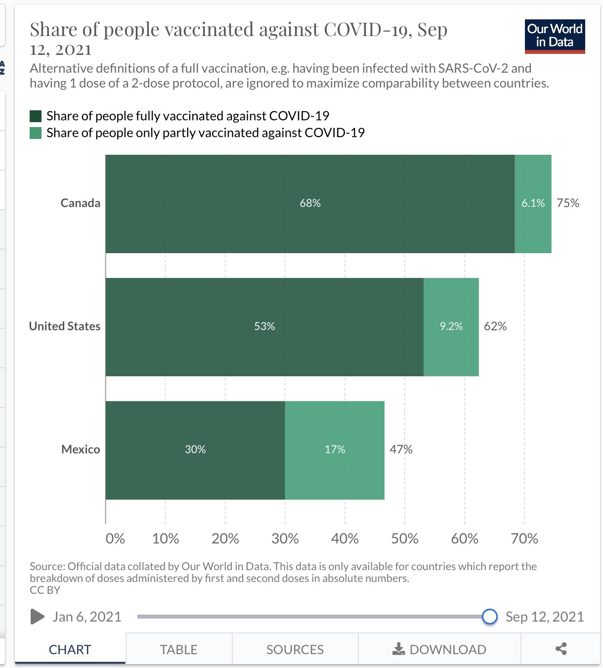 So here are the vaccination numbers from September 19th, so if it is not safe to let Canadians into the United States, than I hope the newly elected government of Canada closes the border to American travellers immediately as they a full 13% behind us on their vaccinations.