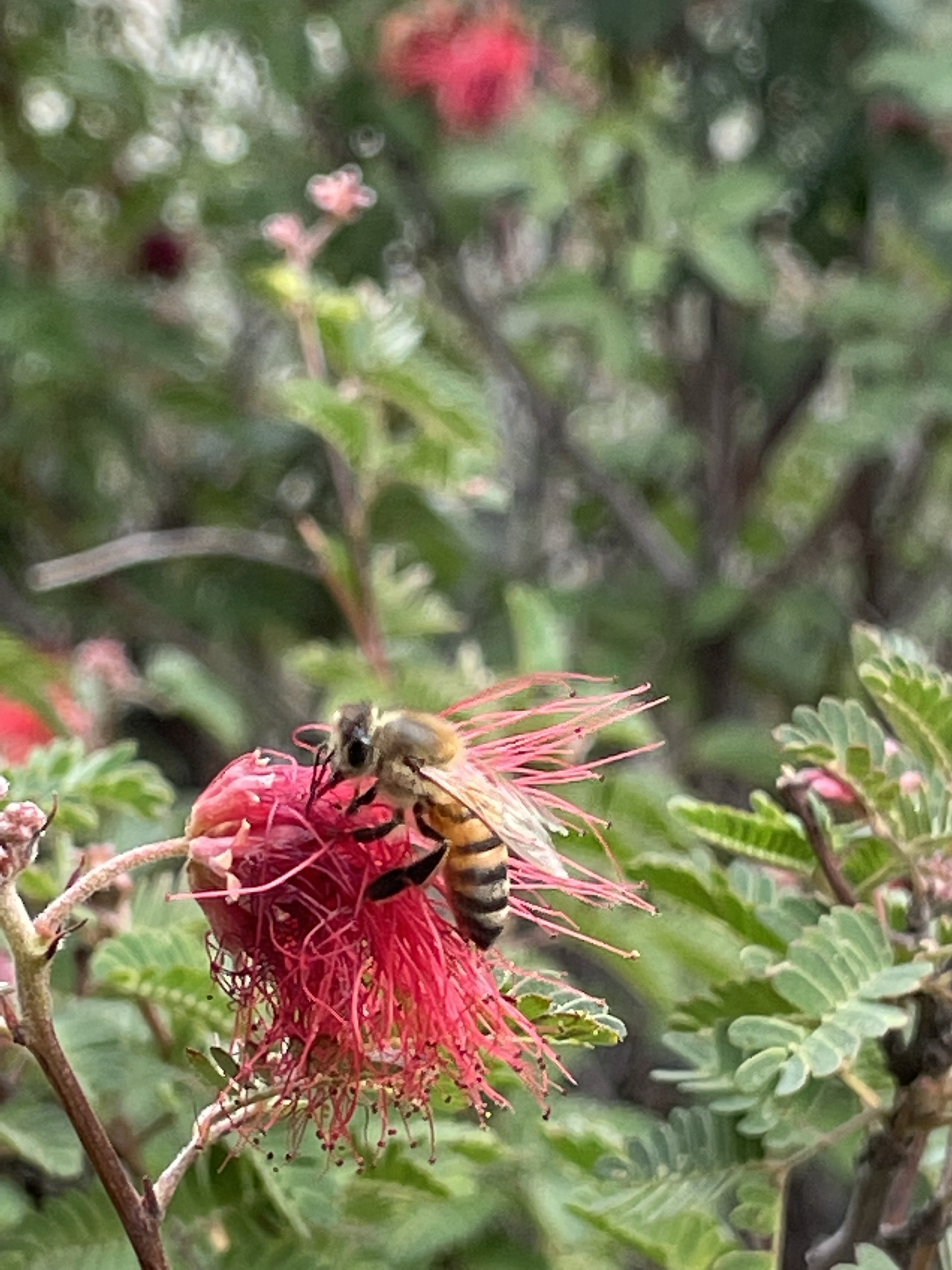 This flowering plant is called a Baja Fairy Duster and since our arrival it has hosted a collection of insects and humming birds feasting on its nectar, and although having what seems like a never ending supply of honey bees their only interest is the plant. The desert has hundreds of leafy plants that have adapted to the extreme heat by having either very small leaves or heavy waxy leaves to reduce their moisture loss.