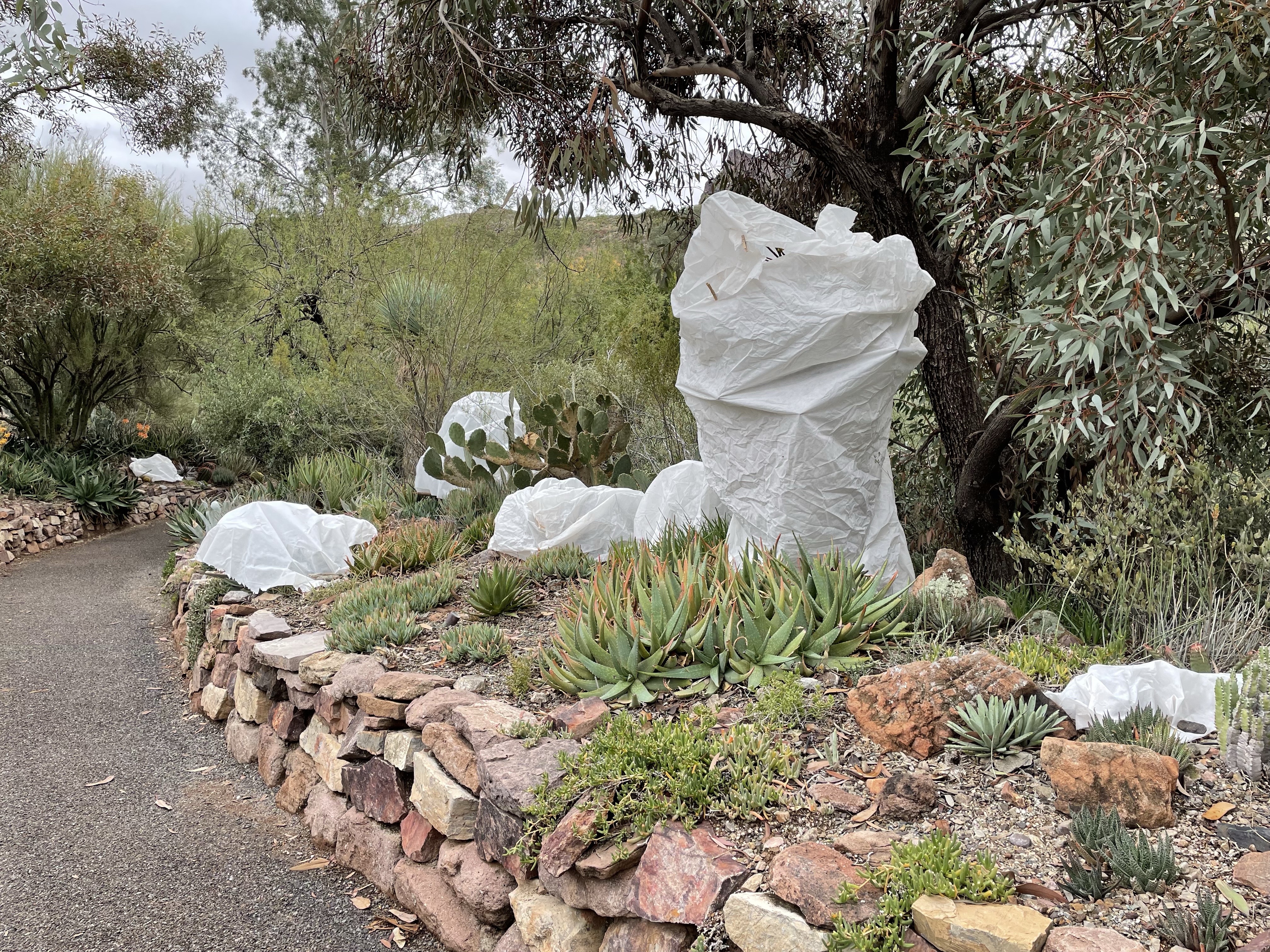 Friday, New Years Eve and an overcast day again, the rain is not expected until afternoon now, and while not what we were hoping for, it has been great to see the desert react to the moisture, as Miss Laurie stated earlier just about how green the desert is. As we prepare for the new year the staff is working hard to cover the most delicate plants to protect them from the freeze warning that we are expecting after the rain quits and the clouds clear. So it looks like we have big white ghosts in the arboretum now, or snow covering in some areas, the arboretum has plants from around the world and some just can’t survive the winter cold without some protection.
