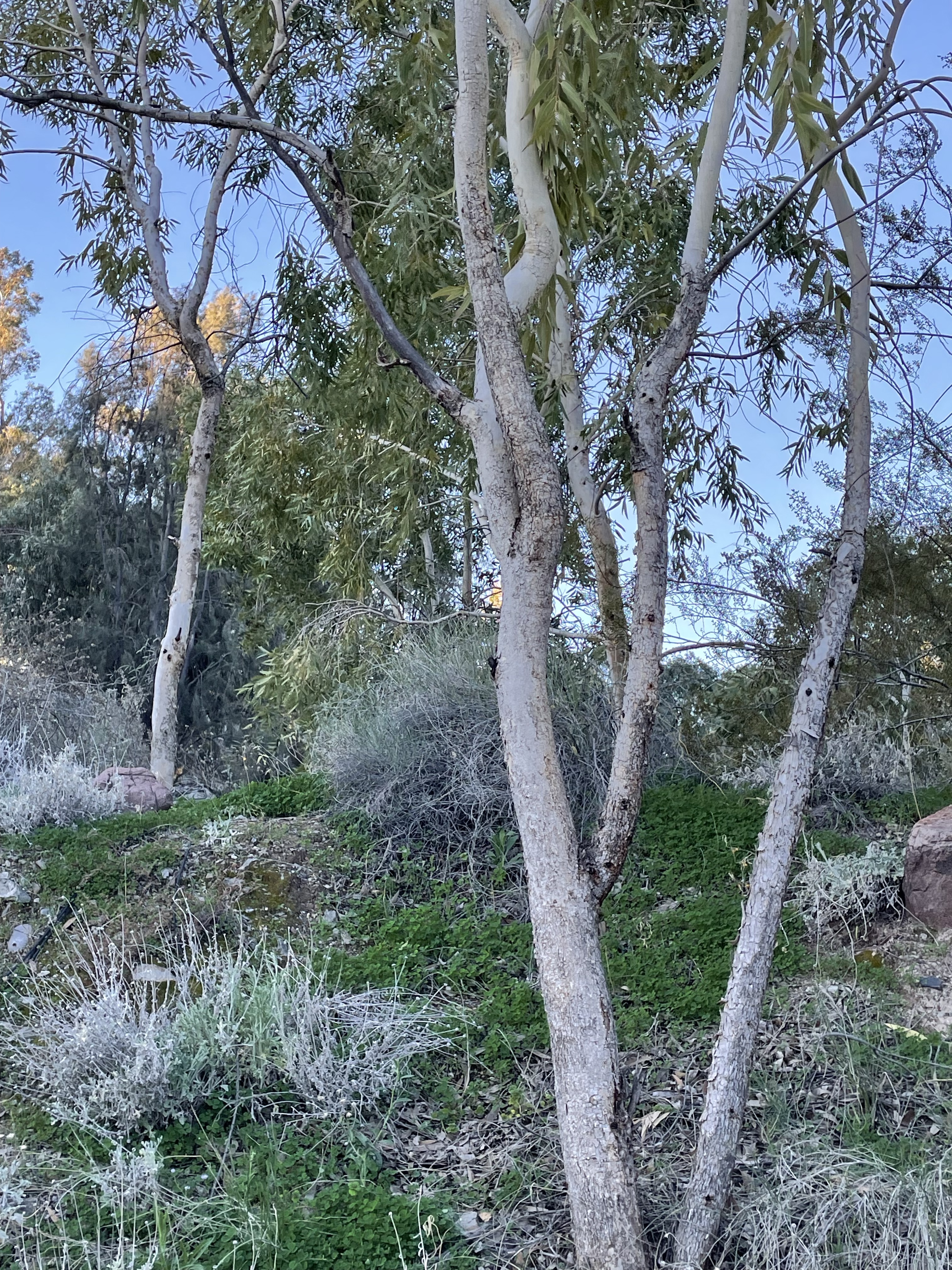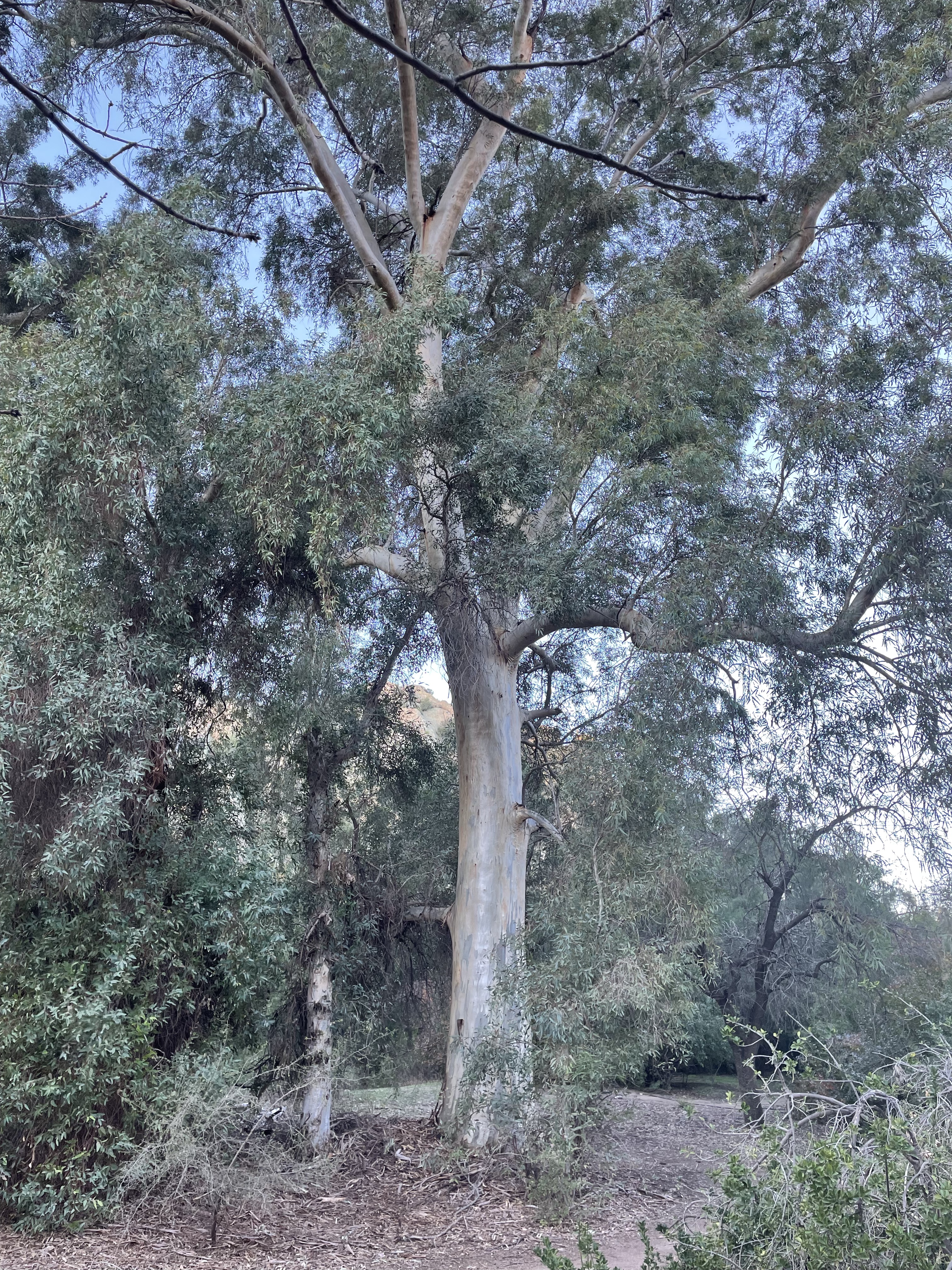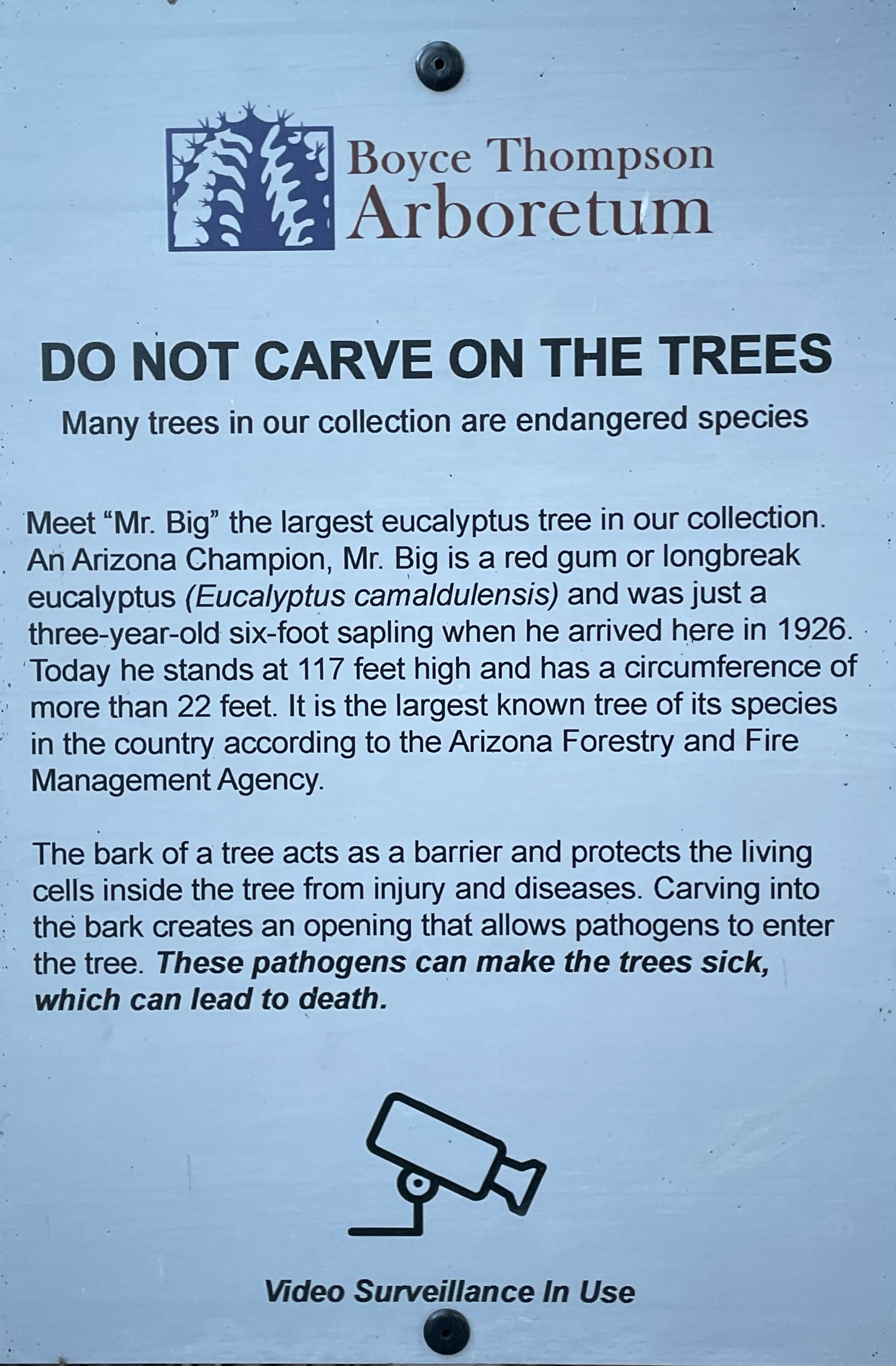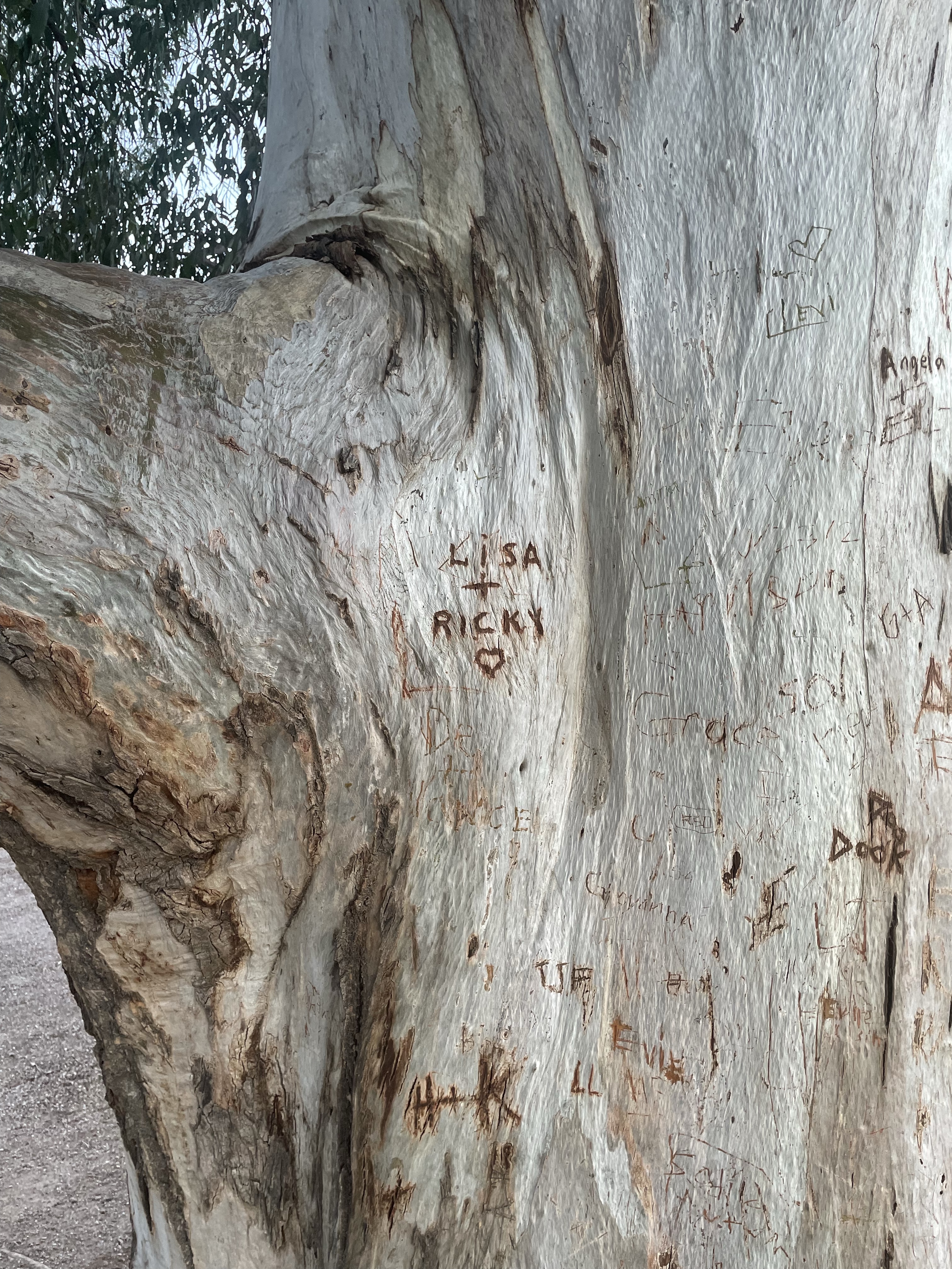 Eucalyptus just one variety of the huge Myrtle tree family with over 700 variations under the Myrtle umbrella. We are fortunate enough to have a number of different species in the arboretum, and they range is size from almost shrub like to the tall majestic red gum variety that can stand 200 feet tall. Here at the arboretum we have some of the largest eucalyptus trees in North America, so it breaks my heart to see them defaced.