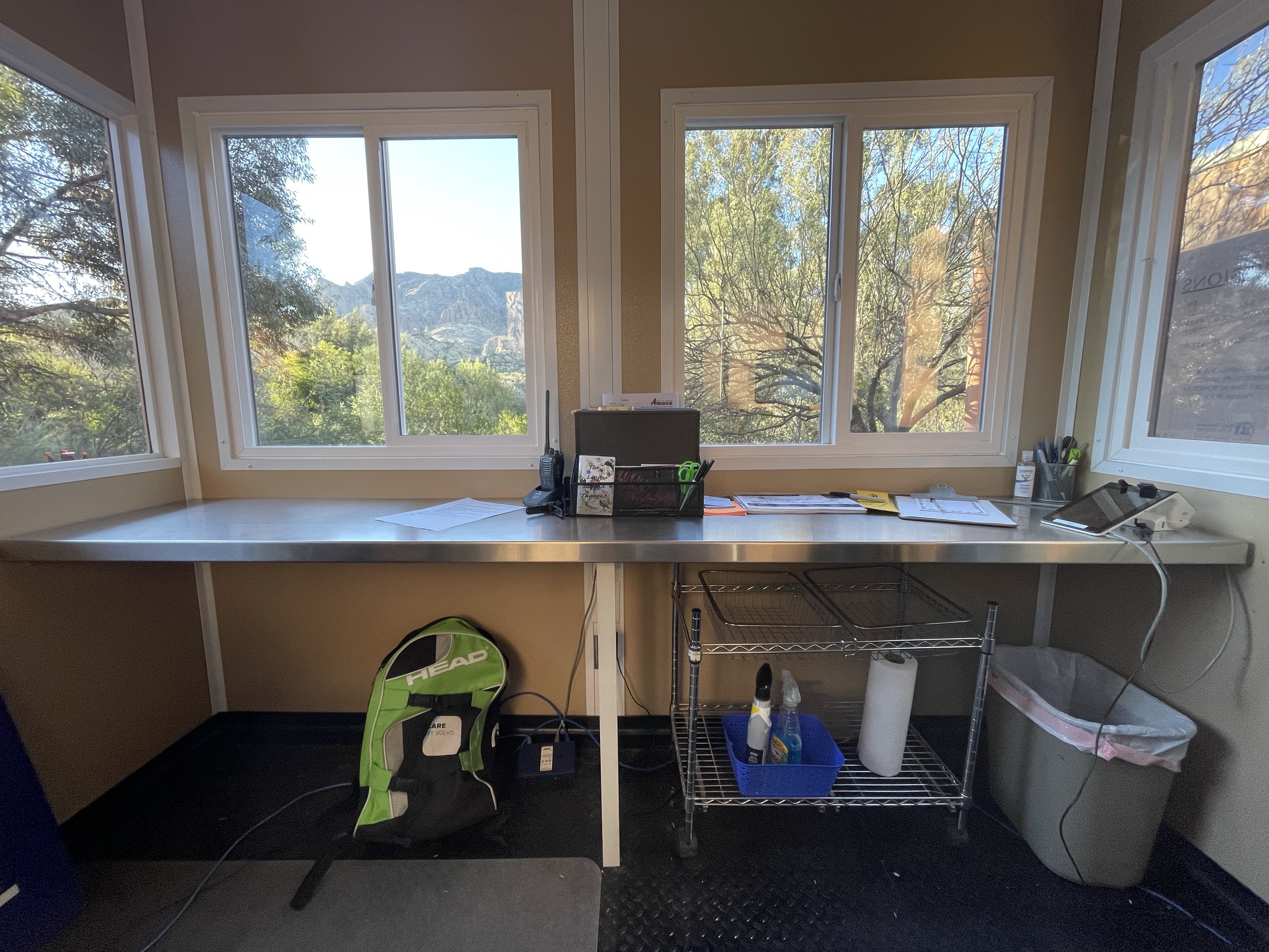 So while I’m waiting for admission number four I decided to do some checking on what it would take to move this counter that is on the south wall of the admissions booth to the west wall where we actually are greeting the guests. And I was pleasantly surprised that the stainless steel counter is actually sitting in a one inch angle, so the removal of a couple of dozen screws and it should be free to reposition on the wall that actually faces once visiting guests. It will also pave the way for the addition of a second check-in window for the members.