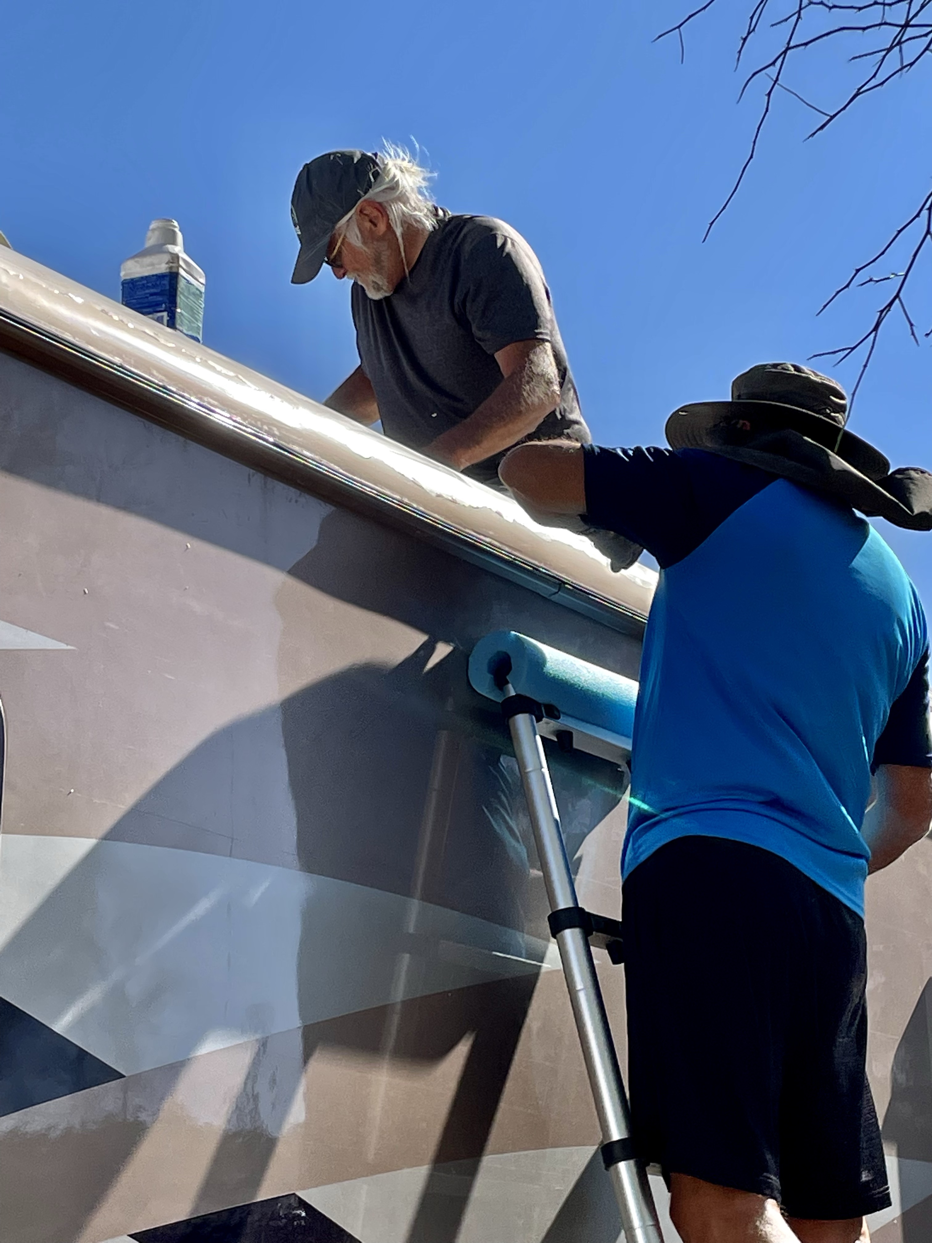 I was able to complete much of the resealing of the roof to rain gutter joint on the left side of the coach, or at least until I ran out of sealant three inches from the end, I need another tube of sealant anyway. After lunch I settled into the antigravity chair, and I could hear a diesel running, and I made the assumption it was just another delivery, but to our surprise it was Tom & Kathleen back, they had taken their coach to the repair shop, and were supposed to go visit their daughter in Colorado, but an illness had derailed that plan so they were back a couple of days ahead of schedule.