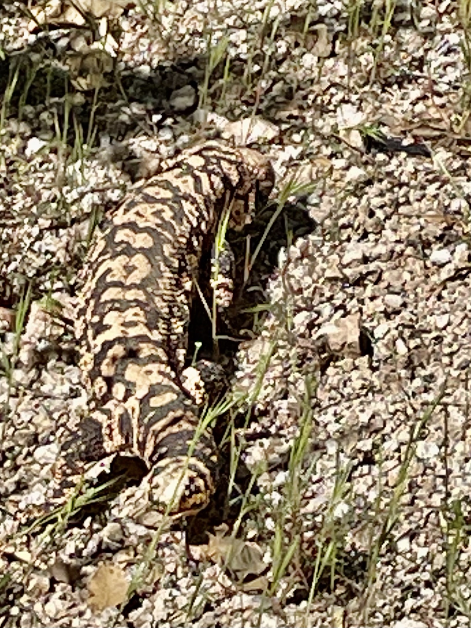 A creature called the Gila Monster, also a sign of spring in the southwestern desert, the photo was taken by Miss Laurie with her iPhone.