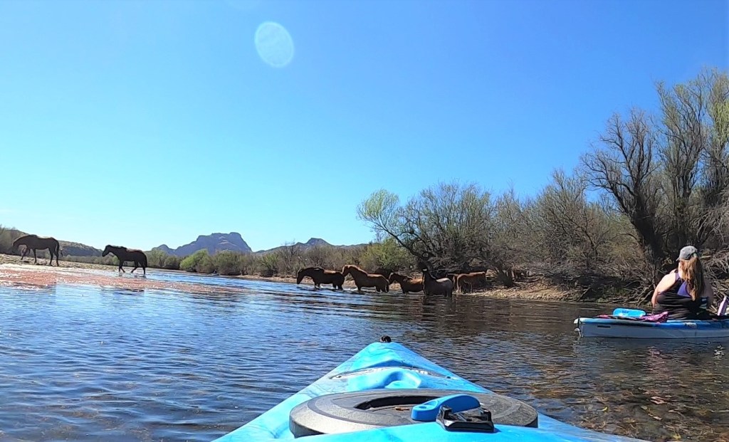 At this point we seemed to gain an audience, there had to be fifty wild horses on the shore and at least a dozen people on the other shore with cameras, now we are back in deeper water but our path is blocked by the horses, but at least everyone is enjoying the horses for the time being, because the adventure just went downhill from there. We were in and out of the kayaks at least a dozen times before we made it to the previous weeks entry point. We now know that it is at this point that the Salt and the Verde rivers meet, and it was obvious the Verda river that had been supplying the big current the week before. So at least from here to the exit point there was good water, of course it was late afternoon so there was also some wind now as we paddled across open water to our exit point.
