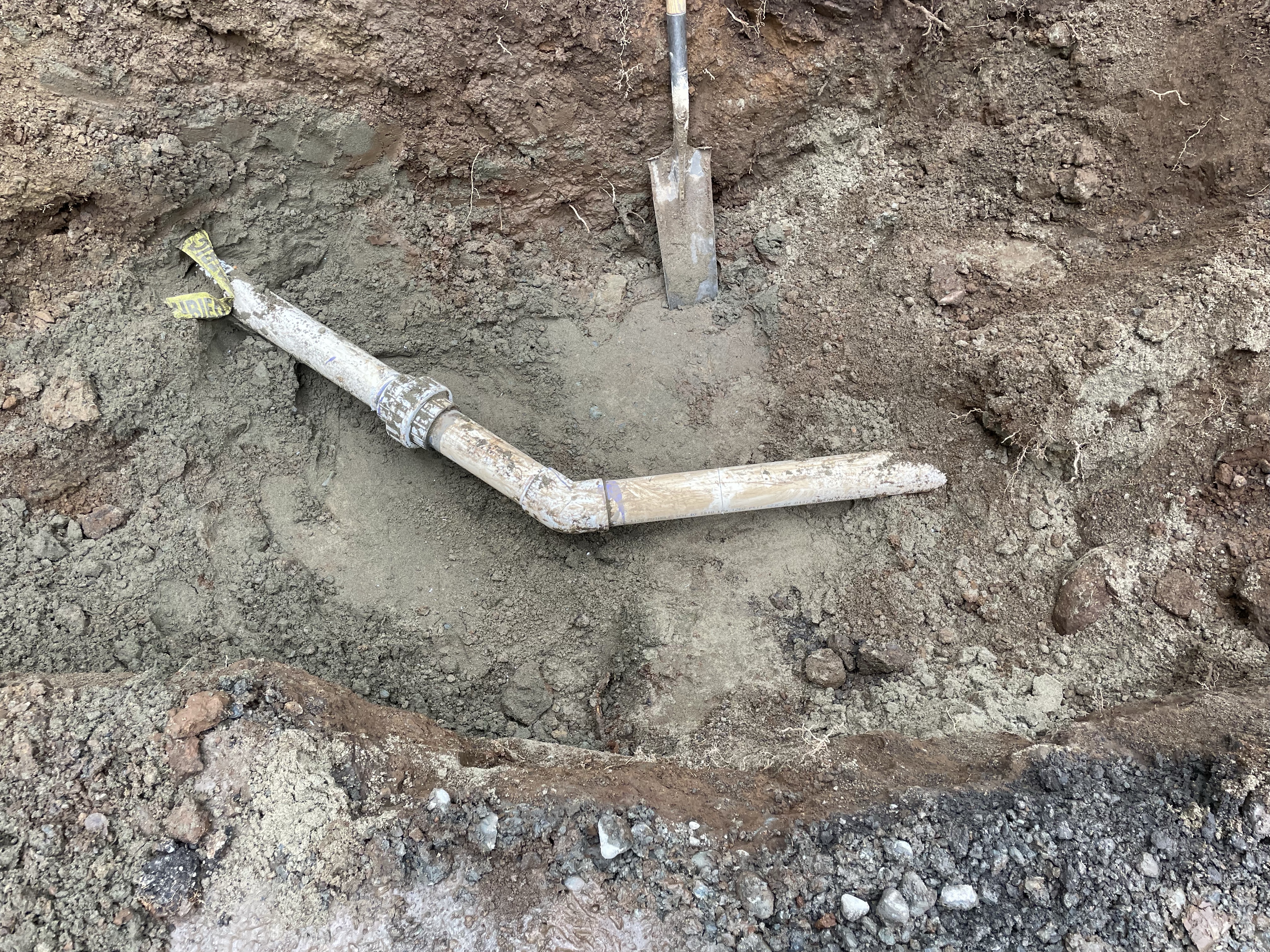 So the plan was at 11am we would shut down the water line down and try to correct the failed repair, the problem with plastic and glue, is if it comes apart it can’t be reused, so we had to get new plastic fittings, so at eleven o’clock we started digging to confirm where the failure was, it only took a couple of scoops to tell where the failure was, water at 125 psi makes itself real easy to spot. So we shut the valve to the line, and very near the break was the drain for this line, so the drain was opened to allow the water to escape, then back to digging in a hole full of water (rubber boot time again), this time we had to dig a trench to drain this hole so I could dig the pipe out. Upon inspection the failure was at the plastic joint that that had the short collar, but I suspect the failure was caused when refilling the hole after the repair.