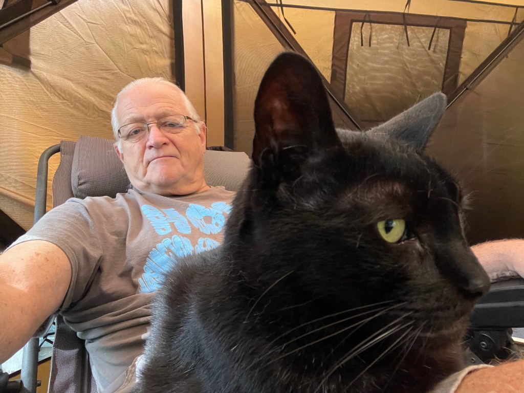 So Mister Sam and I are in the Clam, he is on bird watch from the comfort of a chair, as this view point offers full view of the feeder on the side of the coach as well as the feeder in front of the coach. It also makes a great place to catch a nap when the bird activity wanes, and that seem to happen quite often.