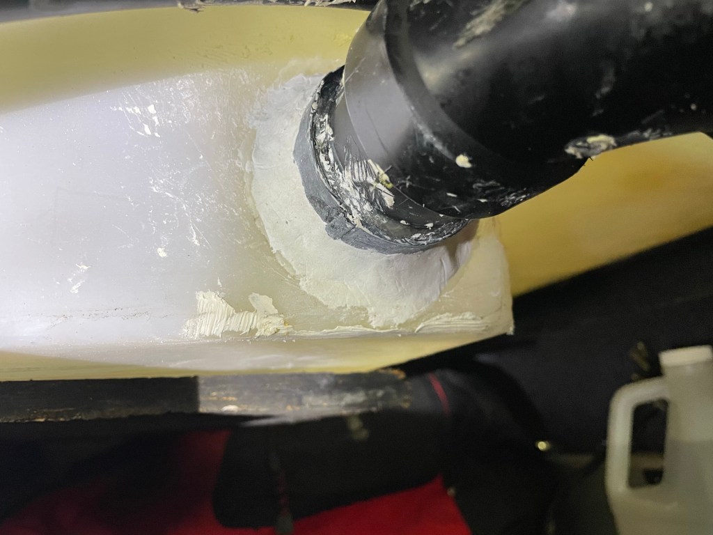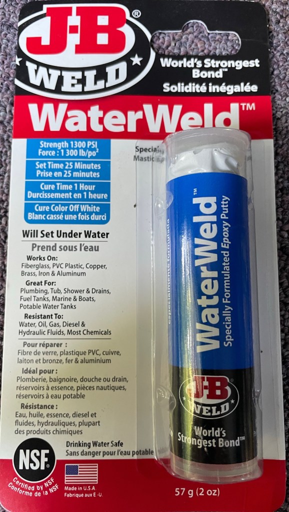 Today’s project is the fresh water tank, this is a leak I thought I had fixed last fall, but was back this spring, so it is time to repair the leak for good. Last fall I had used a product called “Flexseal“, and while it did the job for the trip south, and held the tank full of water almost all winter, it started to leak on our trip north, so I had to dump the tank and place a portable heater in the basement to dry the carpet. And then I just pouted that I had to repair the leak all over, and besides pouting I did a little research. Because the leak is at the tank drain area near the bottom of the tank, there is a lot of pressure exerted by 100 US gallons of water, add to that that there is also some flex to the plastic tank, and I suspect the “Flexseal” just didn’t flex enough, and because the leak is at the coupler for the drain, I found a product, it is an epoxy, made by a company called “JB Weld“, this product is called Water Weldand is a two part epoxy that you kneed between you fingers until it is all the same colour then you work it into the area of the leak. And once it is cured should be able to withstand 1300 psi, whether it can or not makes no difference, because the tank itself couldn’t withstand that much pressure. I will let it cure overnight and continue to check it tomorrow.