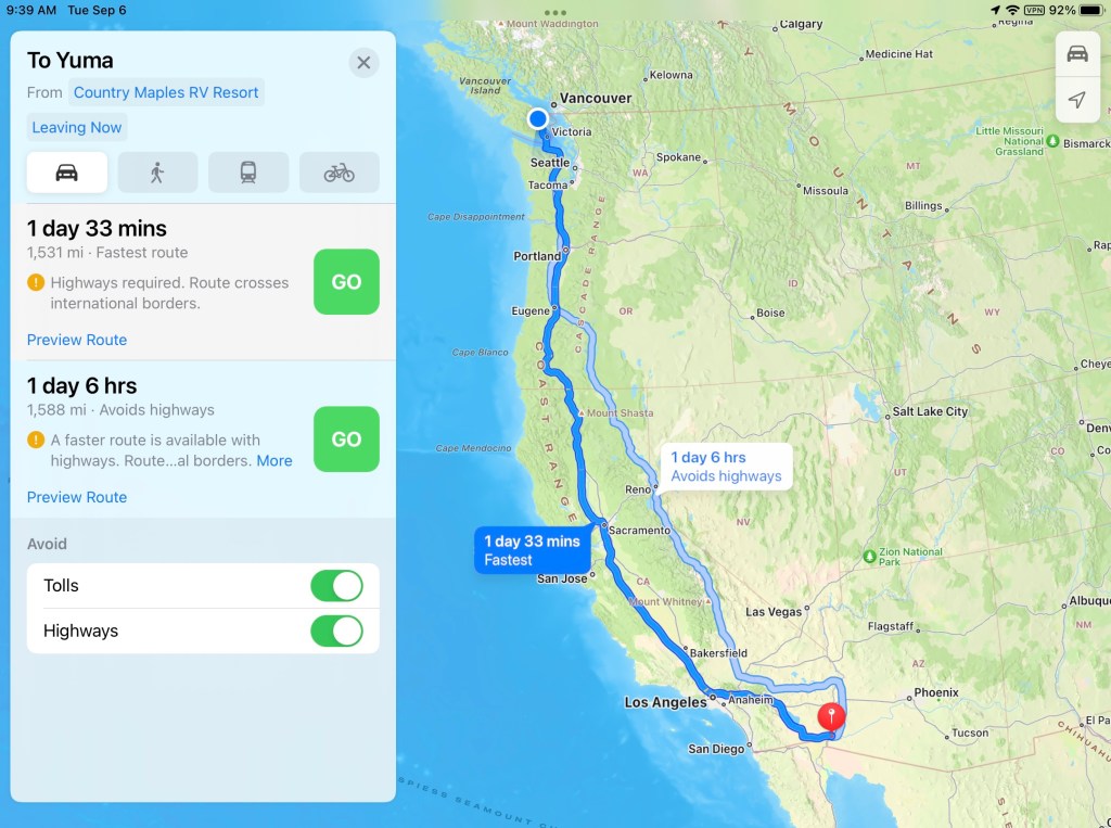 October will be a total month of travel, as we make our way down the Pacific coast of the United States, highway 101 appears to be the route that we are looking at as we start to lay out our route as well as look for places to stay. And by the 28th we need to be in the Yuma Arizona area to met up with the Mexico caravan crew.