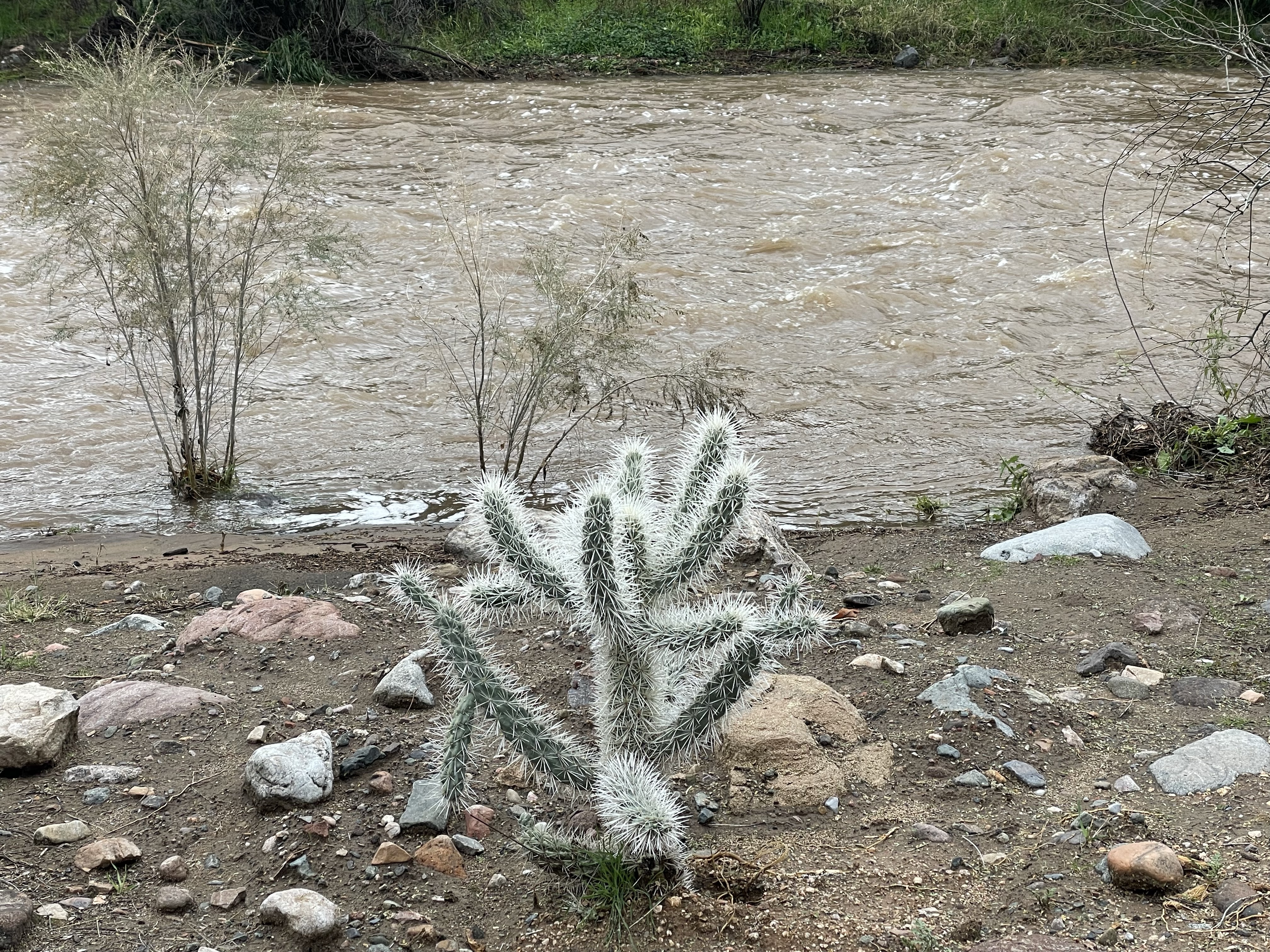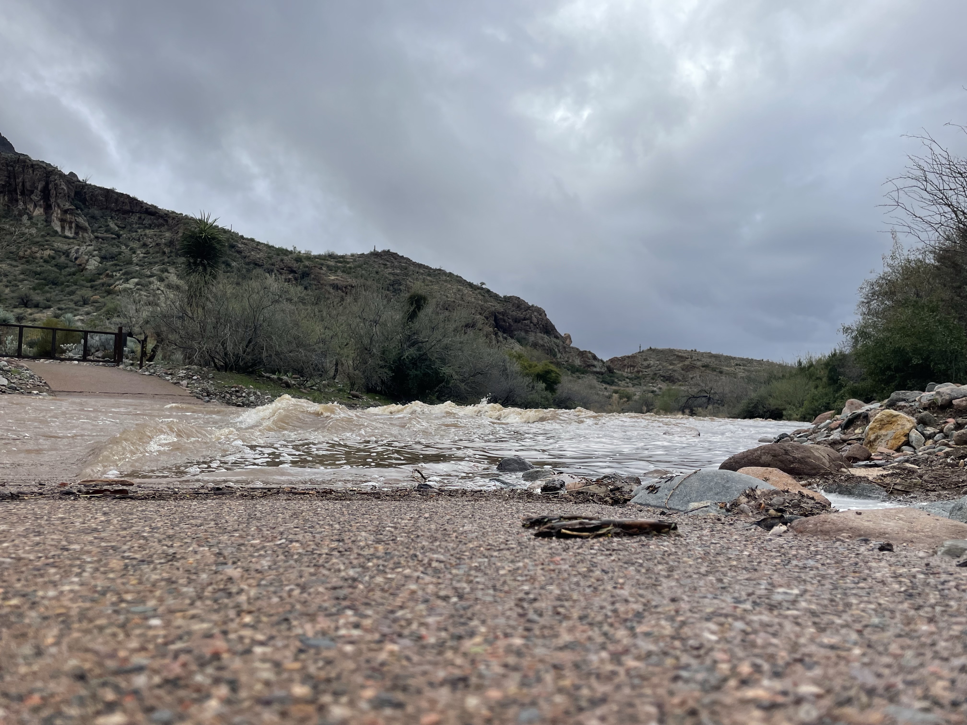 The photos above were snapped around the Arboretum on Monday morning, and Queen Creek was still running strong today, in fact it may be running for a couple more days if all the forecasted rain actually gets here. The first two photos are looking at Queen Creek both east and west from on the suspension bridge, then a couple of cactus photos with the creek flowing in the back ground, and the last photo is of the walkway in the Wallace Garden and the creek flowing over it.