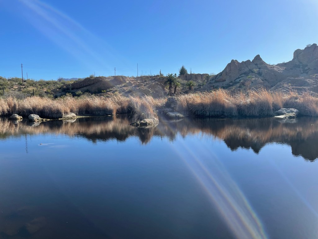 The photo above is of “Ayer Lake” here at the Arboretum, it is not a natural lake, it is a man made lake caused by placing a retaining wall across a small canyon on the property. Then pumping water from a well near Queen Creek which is just the other side of the ridge behind the lake to fill the canyon it was then named after the founders attorney. It is used as a reservoir for the irrigation system, here in the arboretum and has been home to pup fish which are native to Arizona and were introduced into the lake many many years ago. I have taken this photo because they are in the process of draining the lake, for a number of reasons, the first is to repair the retaining wall that holds the water back. Then people had dropped off unwanted turtles into the lake which while may look nice at the time they are not native to the area and are causing issues with some native species. So it is a good time to remove lots of invasive creatures and plants, that cause undo damage to native species. The next phots you see of the lake will be totally different, and I can certainly see the difference form last years water height already as those rocks were barely visible before.