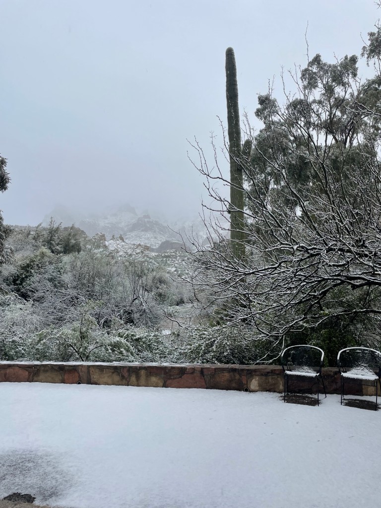 One of the most popular questions I got today was (is it raining?) and of course I had to answer NO, because at the time it was snowing. And another popular one (are you open?) and of course we were, with only a half an inch of snow, there would be no reason to be closed. Or (will I be safe to drive here?) my answer was maybe, I watch the Phoenix news every morning and there are dozens of accidents on a clear dry day, so on a wet snowy day, I’m sure it would be considered high risk at least.