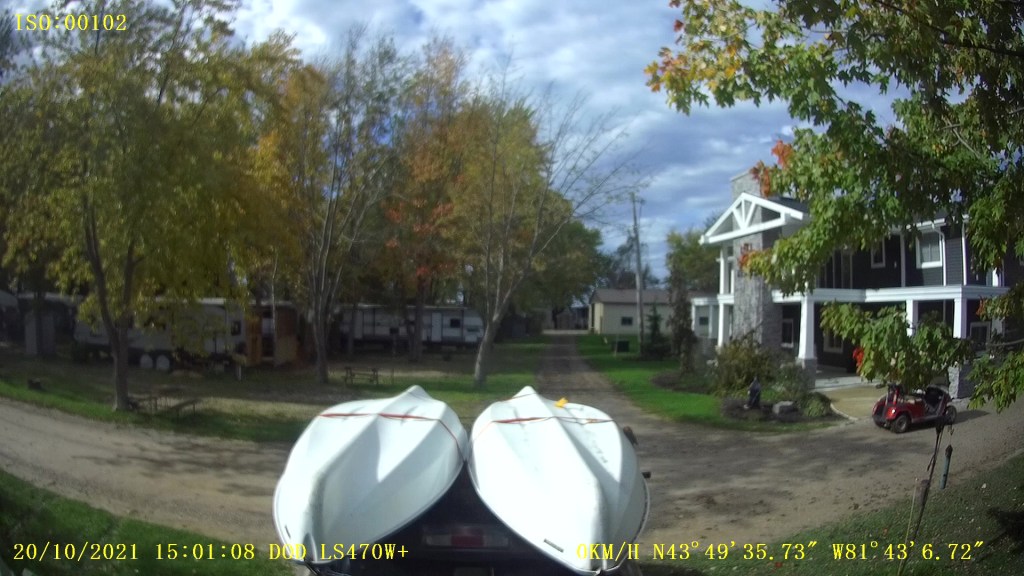October 2021: is here and yes once again we start the month on site #217 at LHR (Lake Huron Resort) but the windshield sun shade will be removed in a couple of days, the sunshade serves dual purpose for us, with its main task being keeping the coach cooler when the sun shines on our huge windshield and the secondary task is to provide some privacy during the daytime hours. It still puzzles me as to how much heat the shade is actually able to reduce in the coach on a sunny day, but as the days start cooling off, that warming of the coach by the sun becomes very welcome. I removed the shade on the last weekend of the park season, so this photo was taken after the park had closed looking out the windshield over the kayaks on the SportTrac, west toward the lake, as you can see the trees still have most of their leaves, as we have not even received a frost yet. This is actually a screen shot from my dashcam which sits attached to the windshield just a little left of center, notice the GPS readings and although obscured by the white of the kayak, it has the speed of the coach in km/h, as well as exact time, just in case of any incident on the road and the wide-angle lens distorts things, but it is a true view from the windshield. Yes I remember that I said October’s windshield should be shorter that September’s rambling post but it appears to be almost as long or maybe even longer … sorry eh.