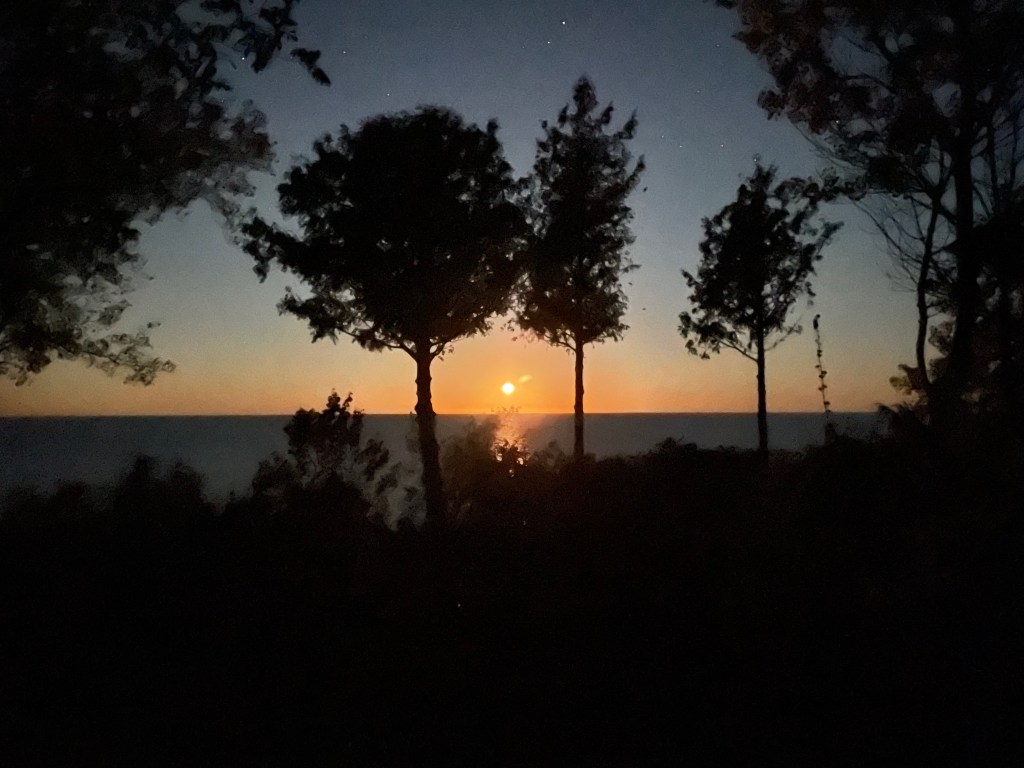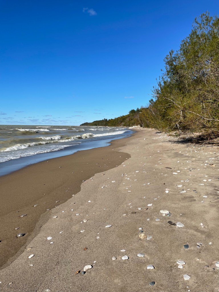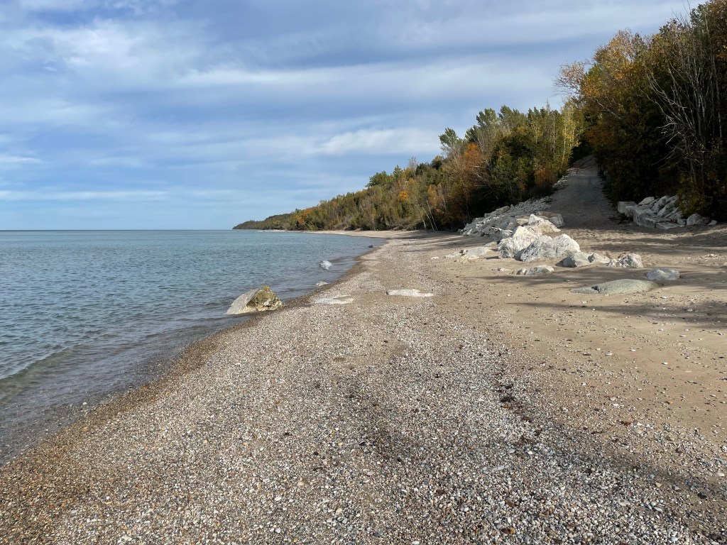 But a sunny afternoon made for a great beach day, the water was calm, and fresh tracks in the sand right to the water indicate some deer traffic, the amount of beach is the most we have ever seen, and frost or no frost there is colour change on some trees at the park, there is a strip of land by the lake that the temperature is moderated by the lake so the trees shed their leaves much later than expected.