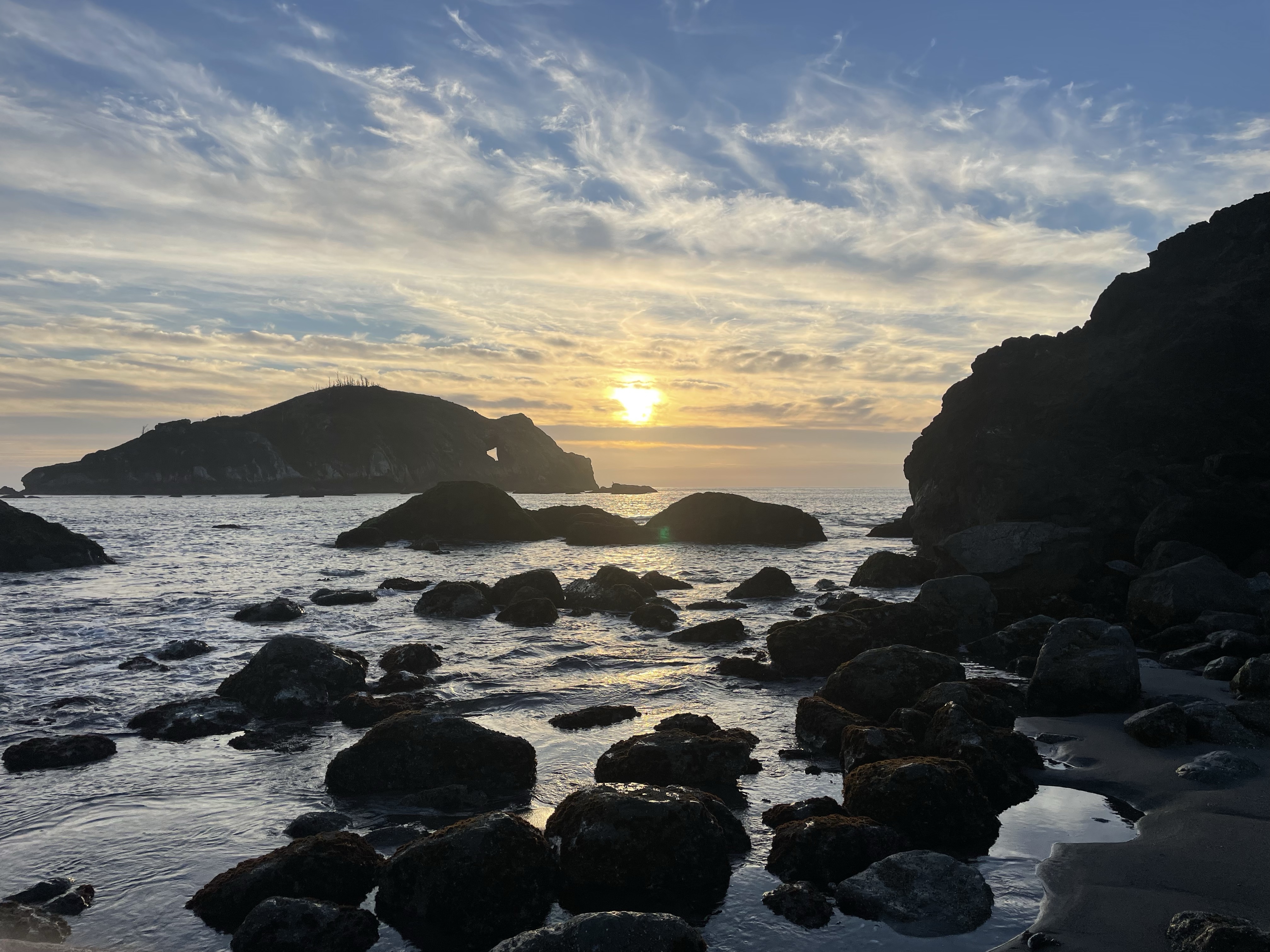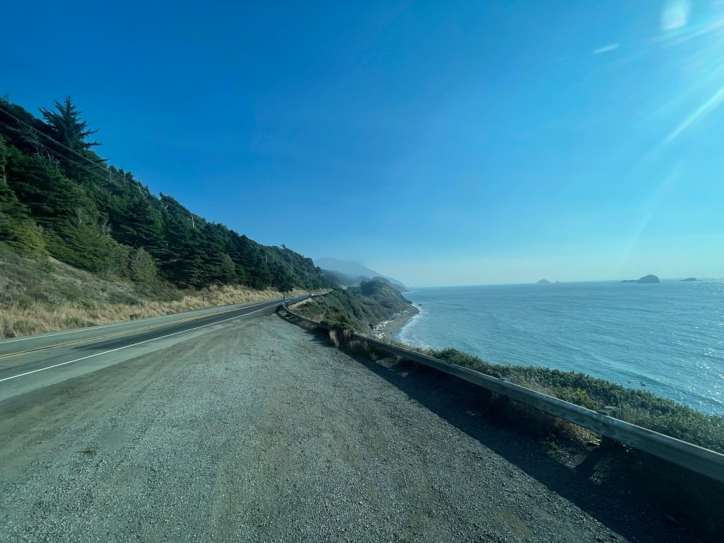 October 2022: Oh the choices for this October’s windshield view are numerous so picking one has been a real challenge, and while all the choices have a special meaning this one won out over all the rest. This photo was taken on US-101 just a few miles north of Brooking Oregon, the sun was shining on us but we could see the marine layer in front of us.