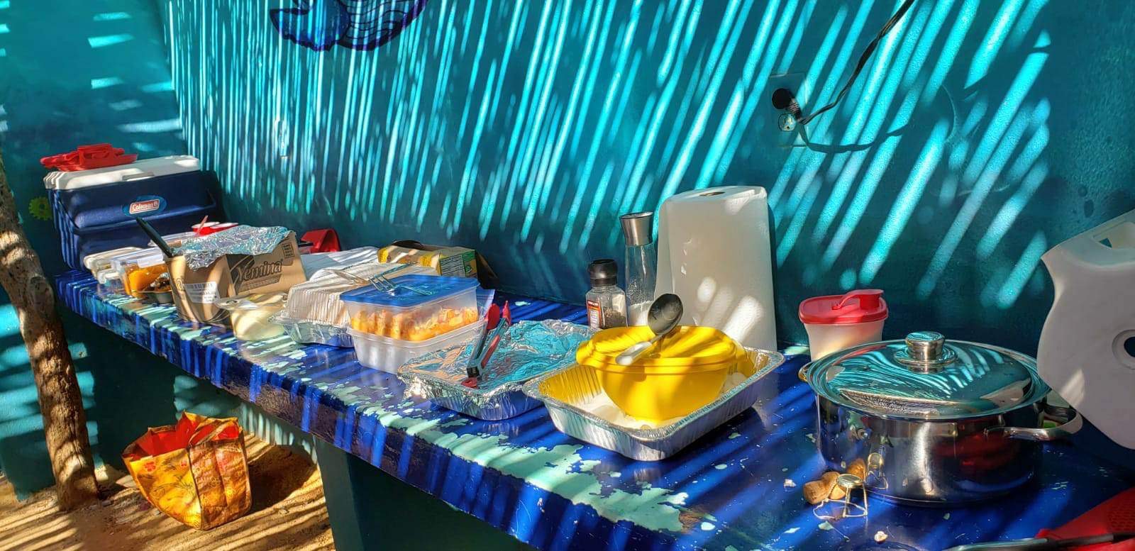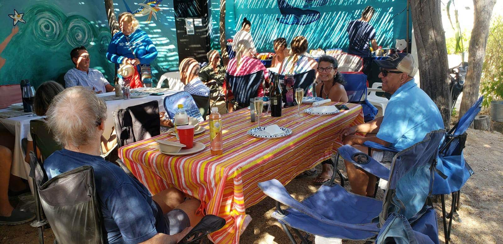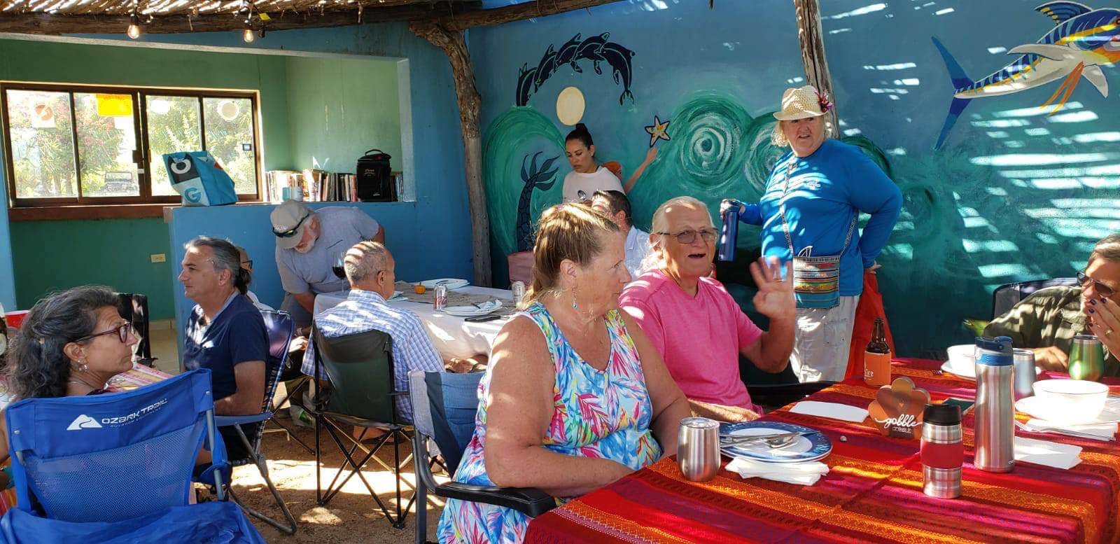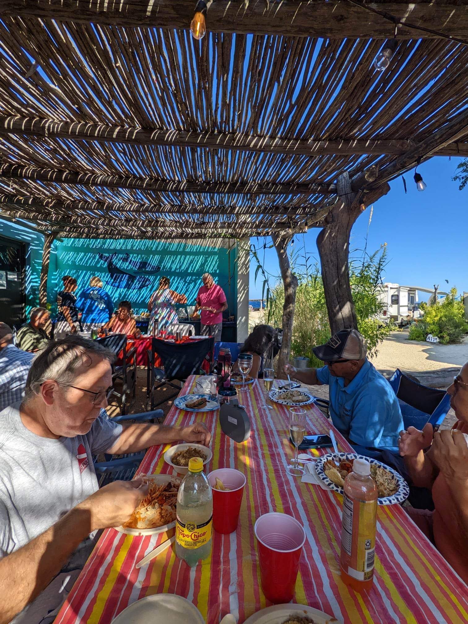 Well it is the day of the potluck, and we need to do some prep work. The area has a couple of six foot long plastic tables, and adding our folding six foot table there will be three, so with six people per table, that covers our seventeen people perfect. There is a long counter on one end, a perfect spot for the food, the counter in the library is perfect for the bar, Paul and I put up some string LED lights that Al had, because as much as “Linner” (Lunch & Dinner combined) is scheduled for two o’clock, it gets dark early. So with every thing scrubbed down, a few insects (ants) dealt with and we are ready. Now some of you may be questioning the number how did we get to 17, as our Baja group was originally 14. Well Richard and Cheryl, long time friends of Paul and Lorena from Las Vegas who now spend their winters in Los Barriles are joining us and they are bringing a Canadian friend Sheila who owns and operates an ice cream shop up the highway at San Bartolo. Sheila has been in Mexico for fourteen years now and runs a thriving homemade ice cream business, who also just happens to be bringing desert, more on Sheila and her ice cream business later in the blog.