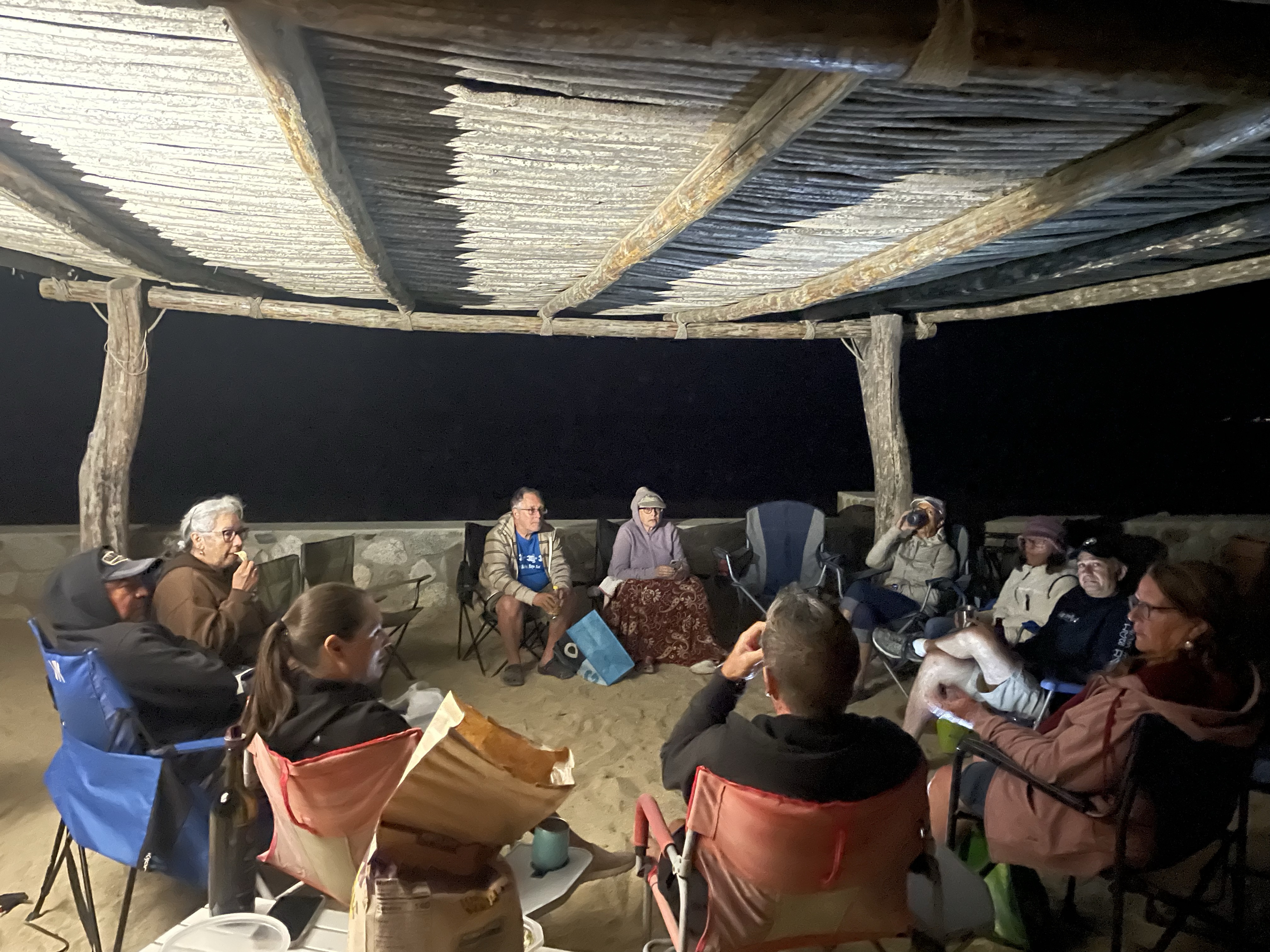 Wednesday, November 23rd, 2022: As I look through the sunshade on the windshield this morning, the water looks calm, there are a few clouds on the horizon which could make for a great sunrise this morning. I can see a couple of fishing boats making their way north on the horizon as the sky takes on hues of orange and pink. By 6:34 the sun had pulled itself out of the Sea of Cortez and we are scanning the horizon for any signs of whales, which now seems to consume much of my mornings. Miss Laurie made a pot of coffee and we sipped as the day unfolded, we decided to walk to this mornings turtle release and found a huge crowd of people this morning.