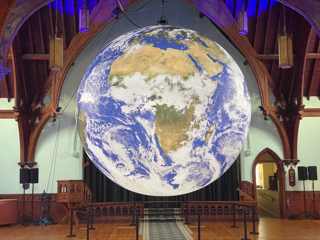 S0 back to google search with this description “earth exhibit in Exeter Ontario” and it brought up the actual exhibit that we would be attending. The exhibit was created by a UK based artist “Luke Jerram” who created the exhibit using detailed imagery of the earth’s surface from NASA. It allows the public to see the earth almost as though they were floating in space looking down at the planet, the exhibit only runs from June 1st till July 3rd. The globe is 6 meters (19.6 feet) across and is called “Gaia” (the word means the personification of the Earth by Greek mythology) and is being hung from the church roof, the pews have been removed and the stained glass windows have been tinted to allow viewing. I also observed that the exhibit seems to have shrank a meter (3 feet) during the crossing of the Atlantic Ocean, as the English description referred to a seven meter exhibit, the price of viewing £5 in England or $10 Canadian here in Ontario.