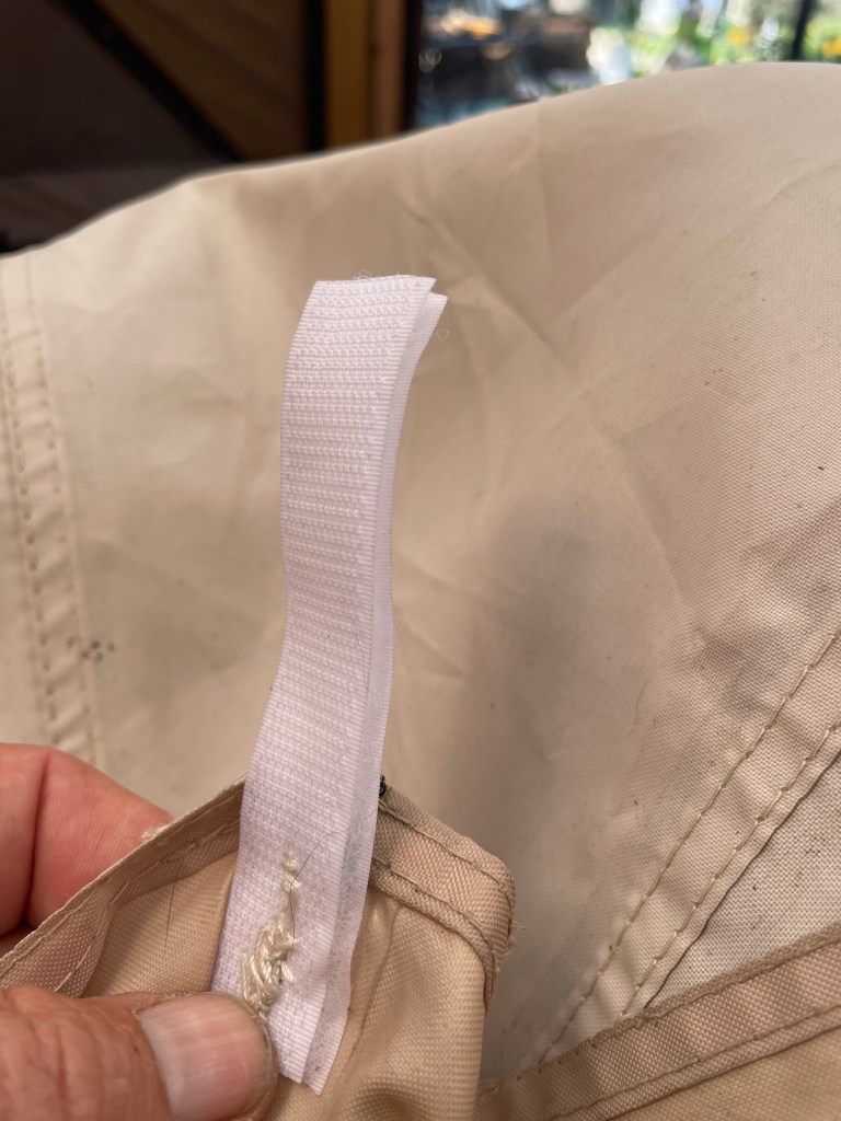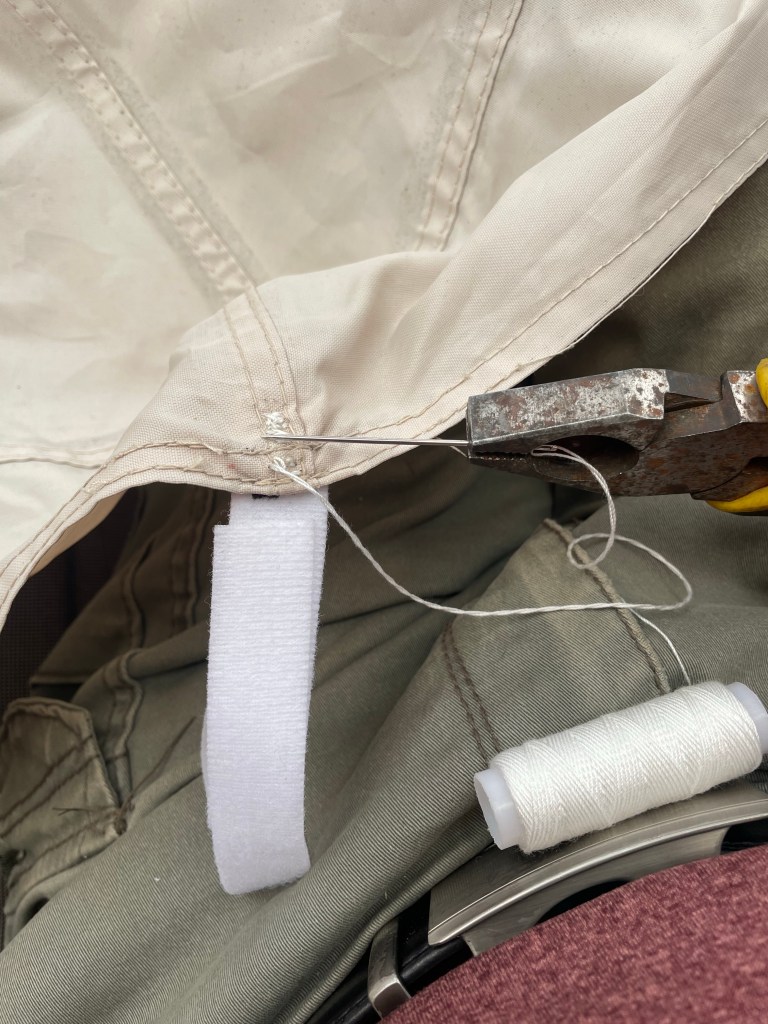 I’m taking attempt number two at fixing the fly cover on the Clam, the new roll of Velcro got here yesterday, so I’m making this my priority project this morning. I’m feeling good about this new design and I feel that I will get a much better result than my first attempt, that is one thing in life sometimes the first attempt just shows us how it needs to be done, and there are lots of redos even in real life. So while Miss Laurie is off to Goderich for this week’s groceries, I’m busy sowing on new Velcro strips to secure the fly to the Clam.