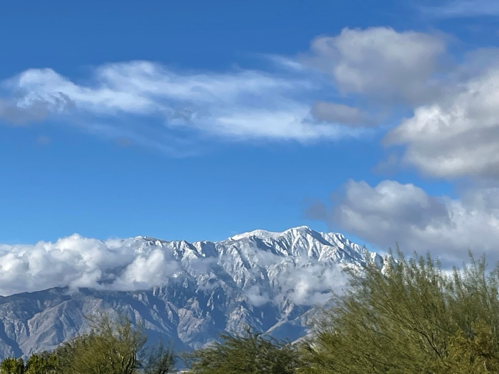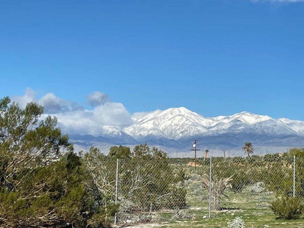 We were up early this morning, as we have moved into a different time zone at the California state line, and while we are still streaming Arizona television we are going to enjoy a cup of perked coffee and a wee Irish blessing, while we wait for the clock. As we closed in on the a lotted time Miss Laurie has gathered up everything required to make more omelets and some blessing for the coffees. We have a plan to explore some areas very close to the resort today, the resort actually sits on or very close to the San Andrea’s fault line which runs almost the total length of California. The line between the North American plate and the Pacific plate and along the actual fault line there are numerous oasis where water comes to the surface and forms small pockets supporting trees and wildlife, but first thing first and we walk across the park for breakfast with Mary & Julie. The clouds have given away to some blue skies this morning and here are the views from our campsite.