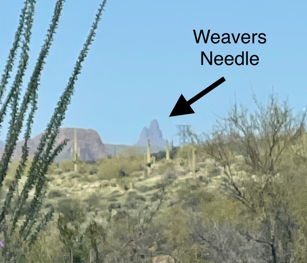 Weavers Needle is a 1,000-foot-high (300 m) column of rock that forms a distinctive peak visible for many miles around. Located in the Superstition Mountains east of Phoenix, Arizona, Weavers Needle was created when a thick layer of tuff (fused volcanic ash)—a volcanic plug[3]—was heavily eroded, creating the spire as an erosional remnant with a summit elevation of 4,555 feet (1,388 m). It is set in a desert landscape of cactus and mesquite bush, with large Saguaro cacti particularly prominent. The peak was named after mountain man Pauline Weaver.