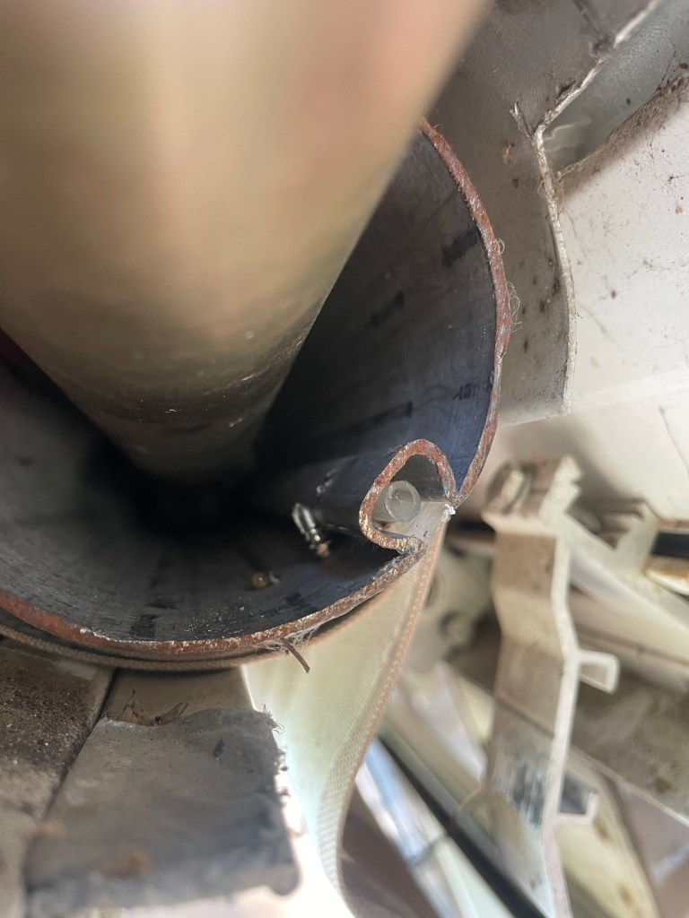 So I extended the awning a couple of feet, than strapped the arms, and proceeded to remove the bracket that secures the end of the motor, Once the end of the motor was disconnected I cut the four wires that control the electrical operation, and as I climbed onto the platform to remove the motor all seemed well. With the end of the motor in my hand I started to pull and it took a little more pressure than I anticipated but once it broke free it seem to be sliding out of the awning tube perfectly, and that is when this project turn ugly. So what happened you may ask, and after watching a number of motor replacements there was no mention of this issue. All I can do is make the assumption that who ever replaced the awning material last time for some reason they decided to install a self tapping screw through the material and into the awning roller. Now this screw is obstructing the removal of the motor!