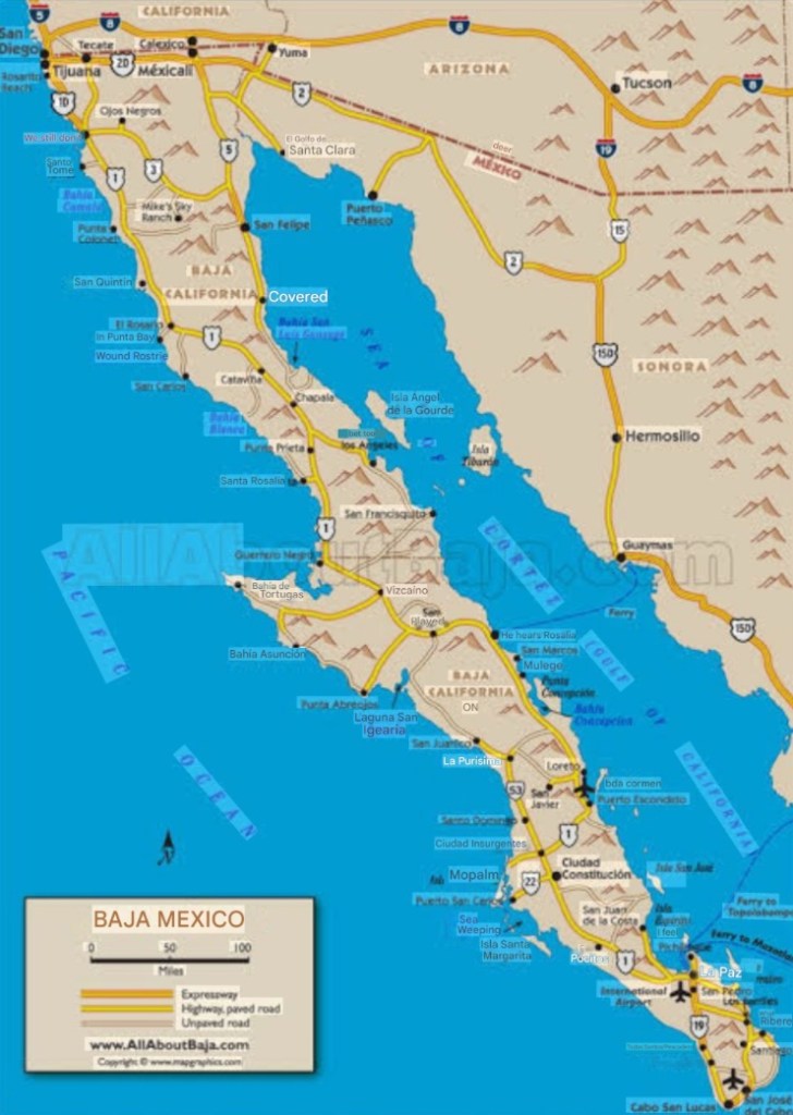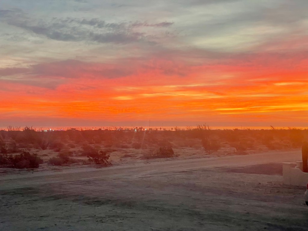 As you could see by this morning’s sunrise we are in for some cloudy days here in the Mexican Baja and possibly even some rain. The Baja is a peninsula that is approximately 100 miles wide and 900 miles long with the Pacific Ocean on the west coast and the Sea of Cortez on the east coast. It is made up of two Mexican states Baja California (BC) & Baja California Sur (BCS). It also has a mountain range that runs the length of the the peninsula, and that range creates two very distinct weather patterns, and right now the western portion is preparing for heavy rain storms while our eastern portion will just have cooler cloudy weather as this area gets very little rain.