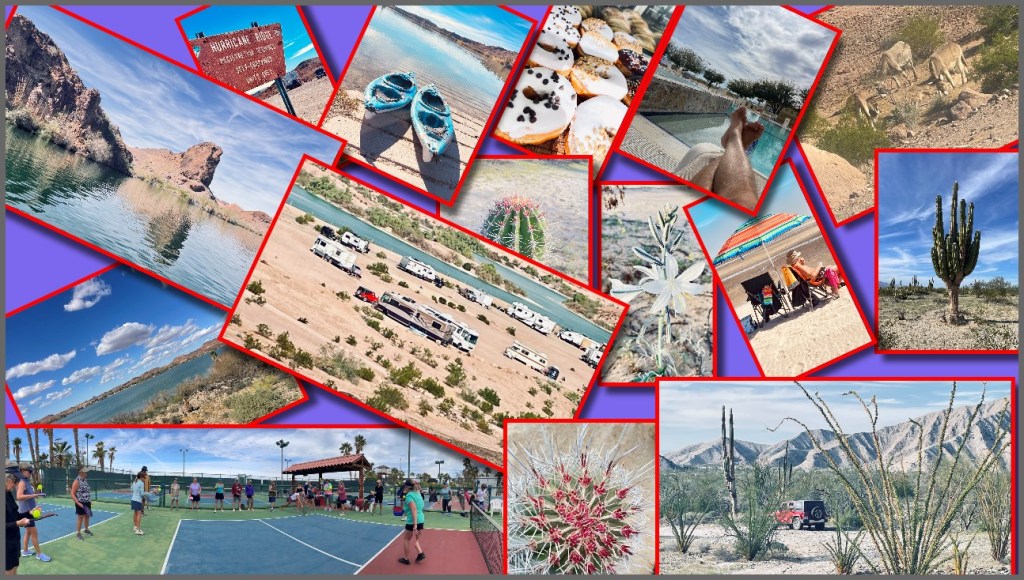 As we close out February we are located on Hurricane Ridge in the Imperial Dam LTVA which is technically in Winterhaven California. This month has been anything other than relaxing, the last couple of weeks has been a busy time around the Coach, We closed our stay at the El Dorado Ranch with little fan fare, Miss Laurie playing pickleball and I was writing and starting to prepare for our departure, always an exciting time with a little anxiety thrown in, will everything work the way it is designed, will that welded torque rod hold up, will our bumper hit while pulling out of this site, how will the border be, will the U.S. Customs and Border guard be nice, will we be able to restock, refuel, and find our friends in the LTVA area all before dark? I’m sure you get the idea, the sadness of leaving some where that has been a great winter home, the joy of being mobile again, the desire to explore, the need to address our solar shortfall, boondocking where there are very few rules and no one really cares what you do. We were also expecting cooler days and nights as is the norm but finding ourselves in the middle of a major record setting heatwave.