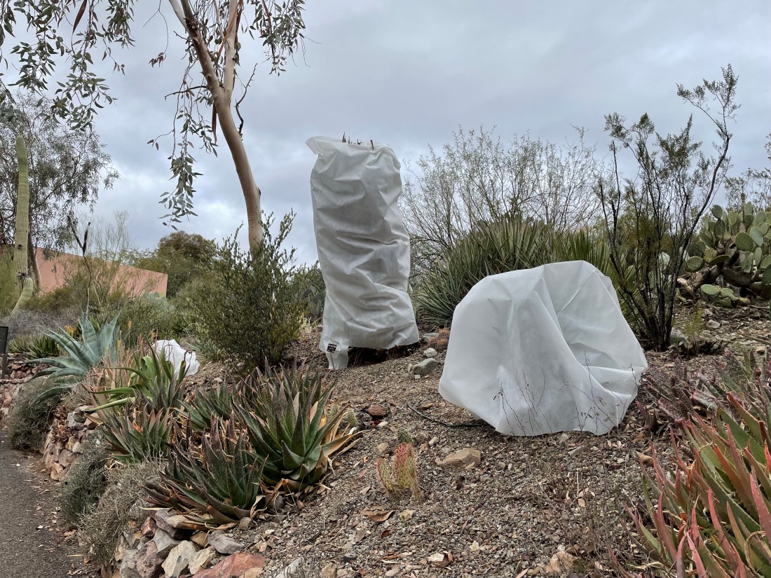 Friday, New Years Eve and an overcast day again, the rain is not expected until afternoon now, and while not what we were hoping for, it has been great to see the desert react to the moisture, as Miss Laurie stated earlier just about how green the desert is. As we prepare for the new year the staff is working hard to cover the most delicate plants to protect them from the freeze warning that we are expecting after the rain quits and the clouds clear. So it looks like we have big white ghosts in the arboretum now, or snow covering in some areas, the arboretum has plants from around the world and some just can’t survive the winter cold without some protection.
