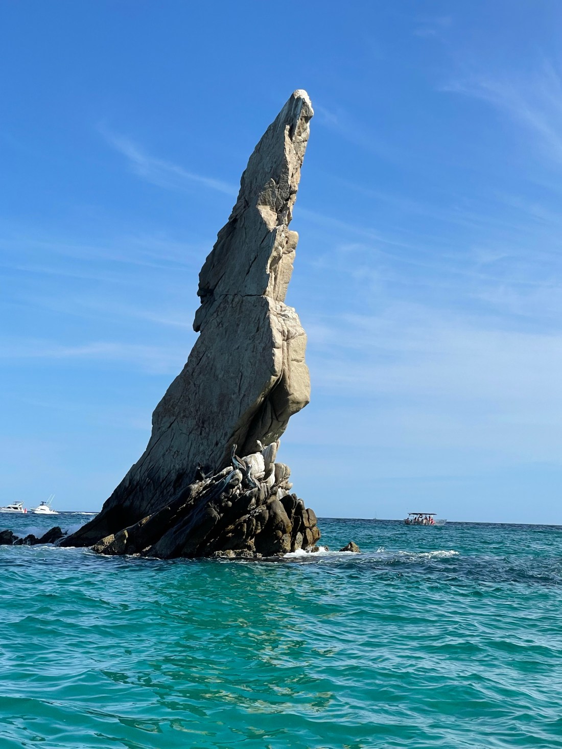 As the group gathered at the marina we were hoping to get on a boat tour, out to “Arch Rock”, “Lover’s Beach”, “ Lands End”, & “Divorce Beach”. As our vehicle was the first to arrive at the marina, Al who speakers fluent Spanish had worked the cost of the boat tour from 35 dollars America per person, down to 20 American dollars, then Miss Lorena walked in and played her “I’m a local” card and got the price down to just 200 Mexican pesos per person (approximately 10 dollars America), so our Captain Hector the Protector took us out for the tour, this tour was actually worth the $35 dollars, as he got us up close to all the great features’ around the tip of the Baja. Here are just a few of the photos that we were able to capture on our one hour adventure. Notice the sea lion on the back of a passing boat, and the small yacht owned by some russian millionaire, it was as wide as our coach is long!