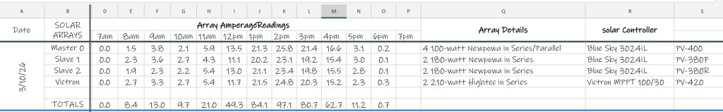 The Blue Sky controller doesn’t give individual array wattage, so I’ve been logging hourly amperage manually. The numbers don’t lie — the newly tilted array is outperforming the larger Victron‑controlled array by a noticeable margin.