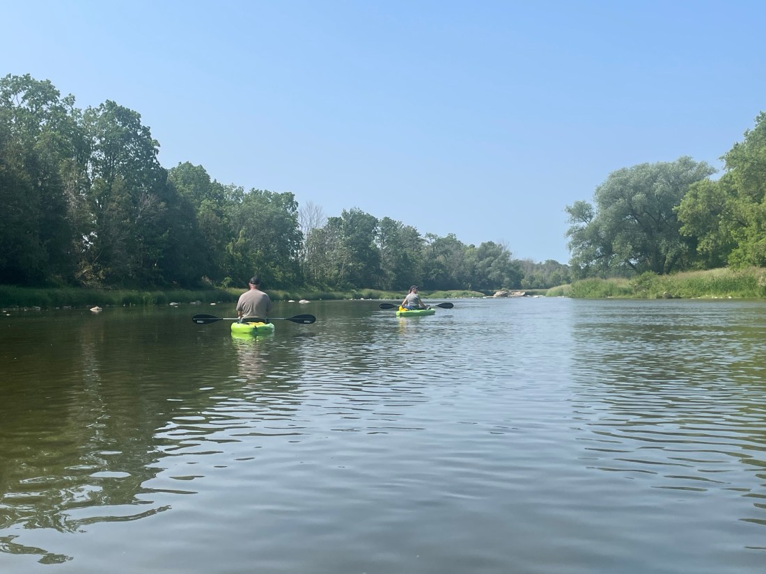 Tuesday morning and we are off on a kayaking adventure, we have always thought that there should be some good kayaking on the Maitland river but have never figured it out, so we are looking very forward to this adventure today. It’s 9:30 and I have the kayaks reloaded, and we are headed to the village of Auburn and to our entry point into the Maitland river, after unloading the kayaks Dale and I drive a vehicle to our exit point near the bell bridge a few kilometers down the river from where we drop off the kayaks and left Dales vehicle there and then took our toad back to the entry point.