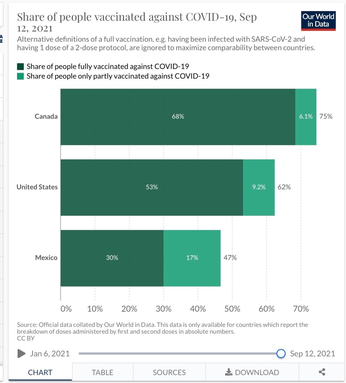 So here are the vaccination numbers from September 19th, so if it is not safe to let Canadians into the United States, than I hope the newly elected government of Canada closes the border to American travellers immediately as they a full 13% behind us on their vaccinations.