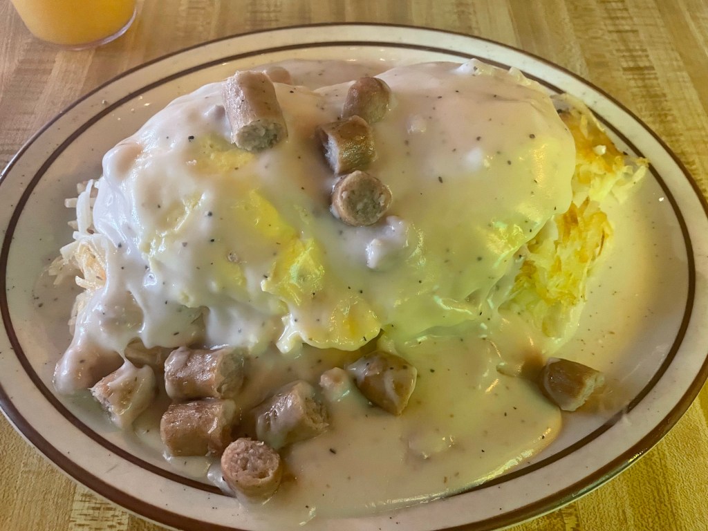 So breakfast at Peggy Sue’s as, OK, I ordered “The Blob”, which consisted of buttermilk biscuits, scrambled eggs, hash brown potatoes, and sausage, smothered in breakfast gravy. And no I was not able to finish it, but it did fill my craving for some biscuits and gravy. And we now have settled into the coach again after breakfast, I have published a couple of blogs and decided to get started on this weeks blog, this could be a bit of a strange week as we should be settled in the Yuma area soon, and by the sounds of it there is no real plan or schedule in place before this caravan comes together, it sounds as it could possibly be like herding cats.
