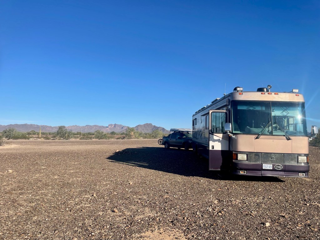 Today we are heading south on US-95 from Needles, then east on California 62 to the Arizona state line at Parker, where the highway turns into Arizona 95, and then south to Quartzsite, where we will top off the onboard propane tank. And as crazy at it sounds we again pick up US-95, as we move south toward Yuma, but in actual fact we have decided to stay a few nights at the BLM land at the Roadrunner location it is 14 day free dispersed camping area, it will be quiet at this time of year and I can position Thunder to get the best solar harvest. Now I know that you might be wondering why not go to Yuma, well there are a lot of reasons, and we will move on to Yuma shortly, but we know this area, and it is a beautiful area, sunsets and sunrises are epic, the mountain views are stunning. The closest 14 day BLM land to Yuma is at the VFH but is on a major rail line and trains run past all night long, it seems pointless to spend $40 for the LTVA land at either Imperial Dam or Pilot Knob which are the actual closest spots. So we are settled in here for a day or two, I have been watching the chat page for this Baja adventure, and I think I’m better of a few miles away, don’t want to start annoying people already.