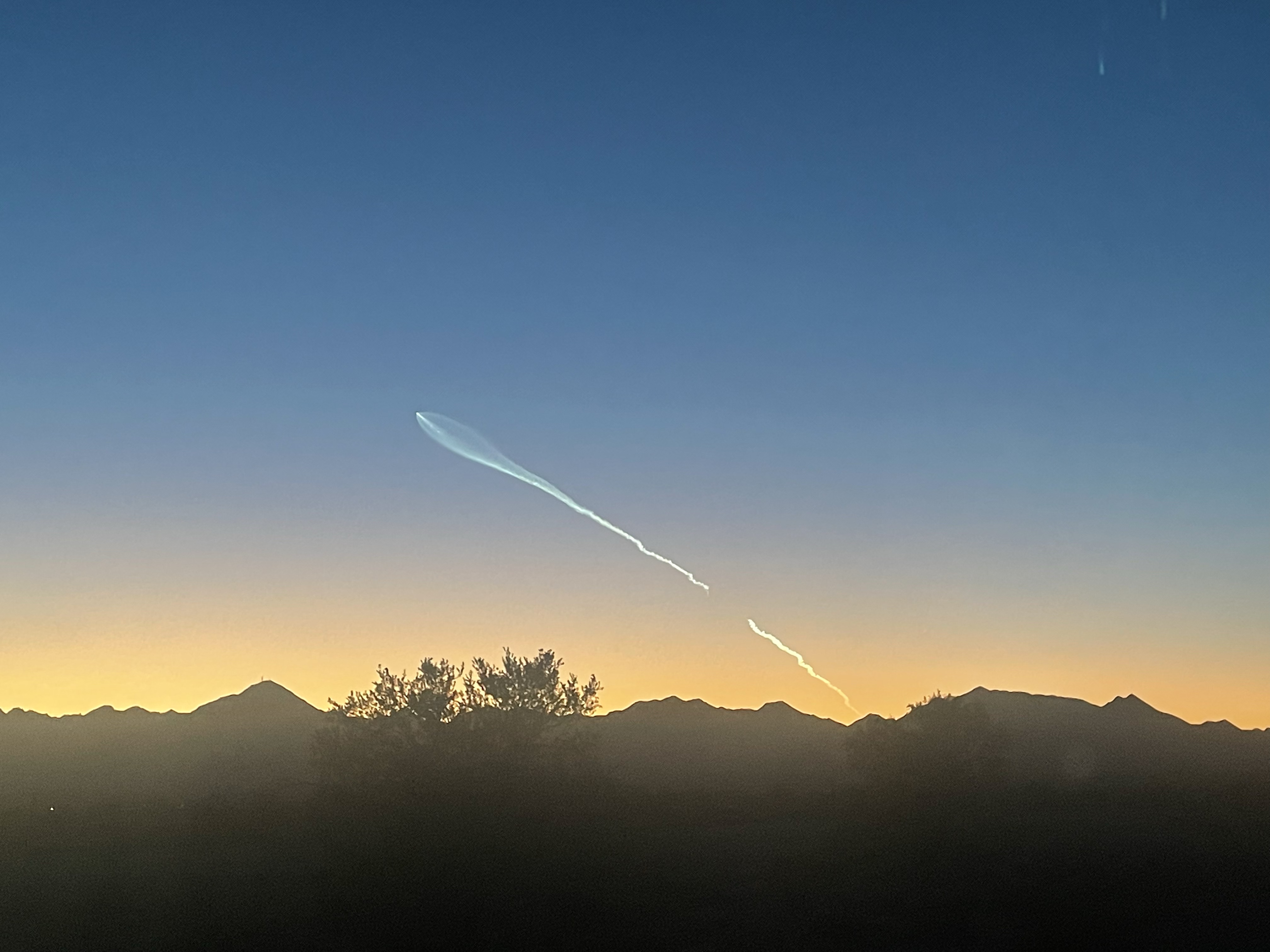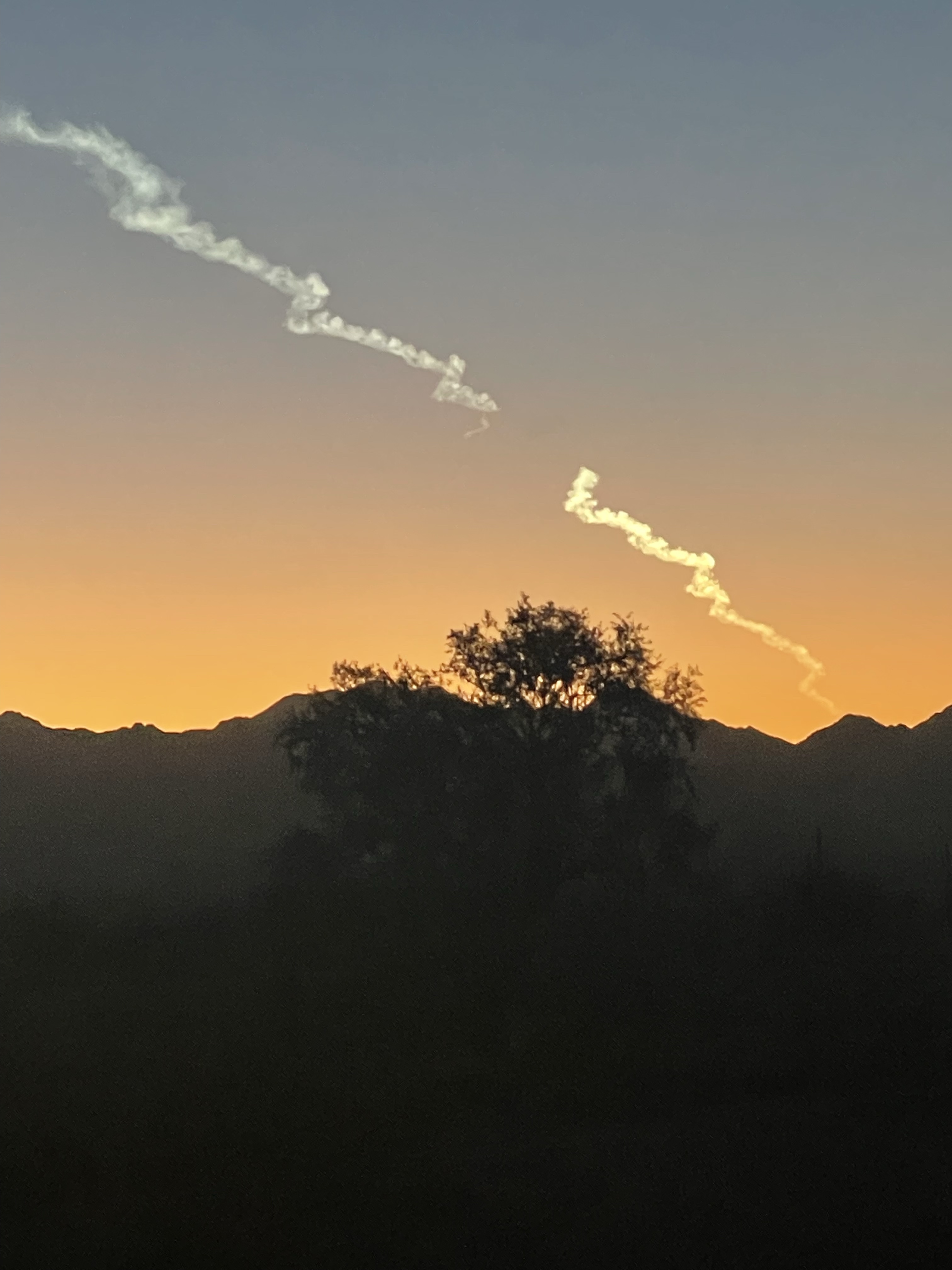 Well the sunset show was as beautiful as a clear sky sunset can be, and just after the sunset we had some man made light show. We have no idea what we were seeing but it was quite a show, as usual photos just do not do it justice. And we now know that it was actually a SpaceX rocket that was launched last evening that gave us the light show, Thanks Chief Twit!