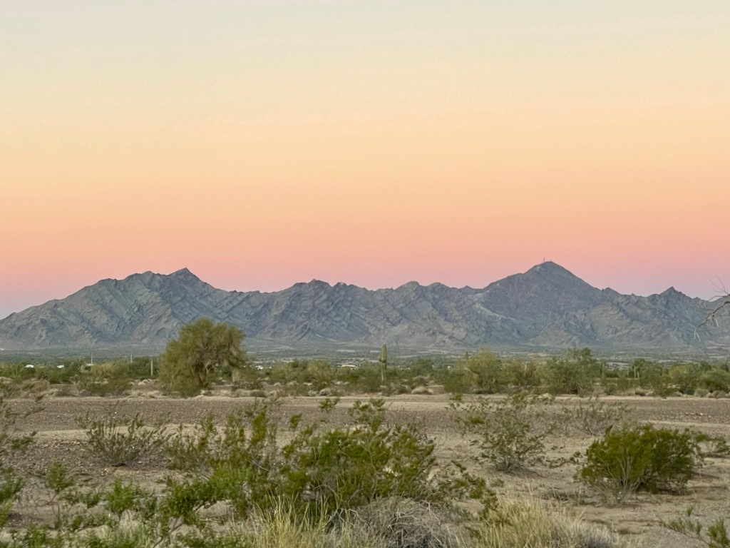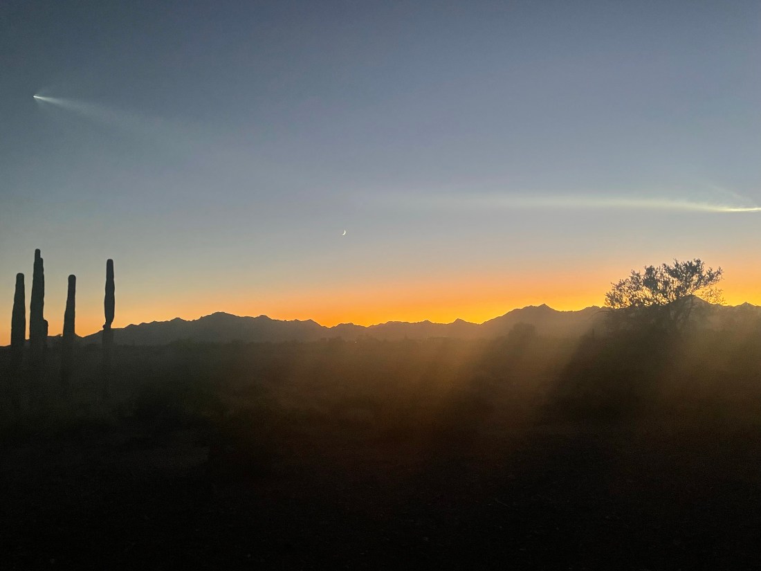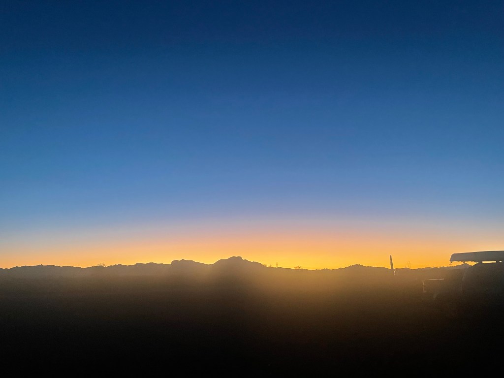 Friday, October 28th, 2022: And it was a very dark, very quiet peaceful night, I’m up at 5:30 but that seems to be pretty standard by now, and by six o’clock I can see the outline of the mountains through the windshield and a couple of small lamps from La Paz valley, Mister Sam is sitting on the dash and seem quite intrigued by something, but I can’t tell what. I love dawn, I always have, it is the prettiest part of the day, and it’s not just the view of the sun rising, it’s more about how the morning light colours everything around us, and here in the desert it’s all about how it paints the mountains with light. Yea I think we have made it back to our happy place.
