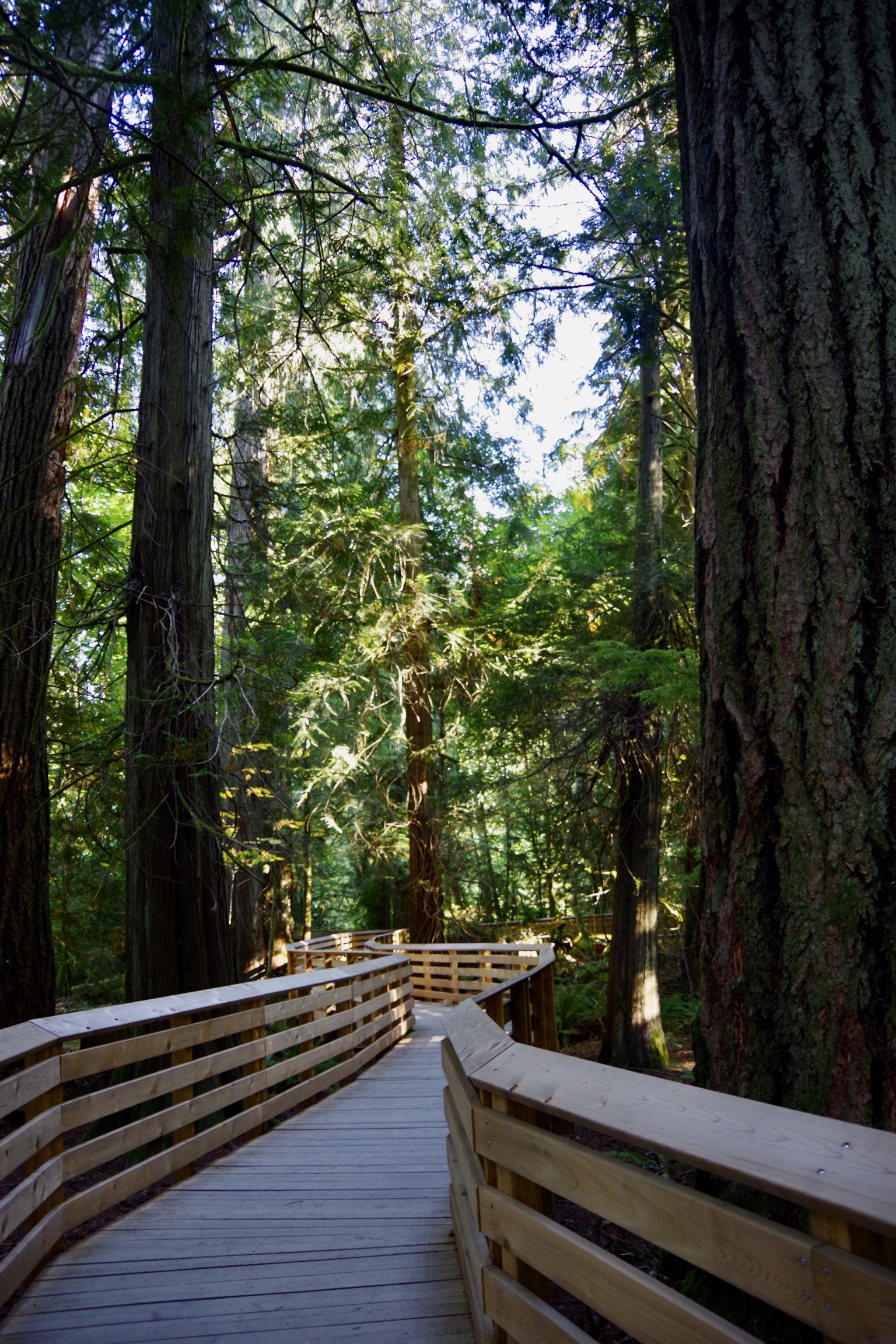 Well today we are just a short journey south down Highway 19, only 60 kilometers (37 miles) today and we are at our Harvest Host location for tonight. We have met the host couple and their children, as well as some fellow campers all the way from Newmarket Ontario, and we are planning on visiting Cathedral Grove today. MacMillan province park is located on the west end of Cameron Lake on Highway 4, it is home to the Cathedral Grove which is an old growth forest, part of the coastal rain forest. There are trees in this area that are in excess 800 years old, Douglas Fir, Western Red Cedar, and Hemlock. With the largest Douglas Fir that measures in excess of 9 meters (30 feet) in circumference. There is a great board walk through much of area, with lots of information boards to explain what we were seeing, I was amazed that these trees grow close to two hundred feet tall, and when they do fall down, other seedling actually start to grow on the fallen trunks, pretty amazing.