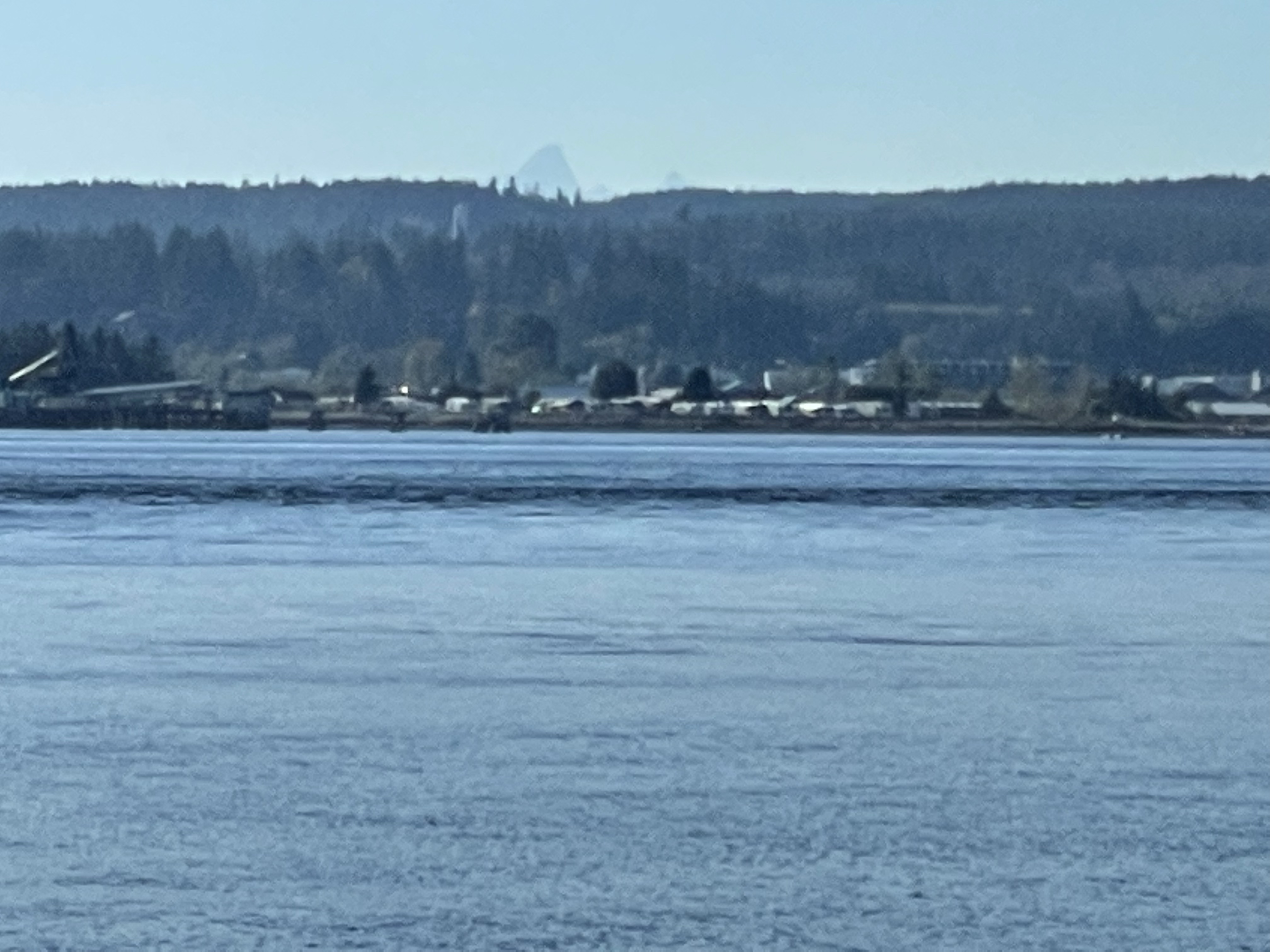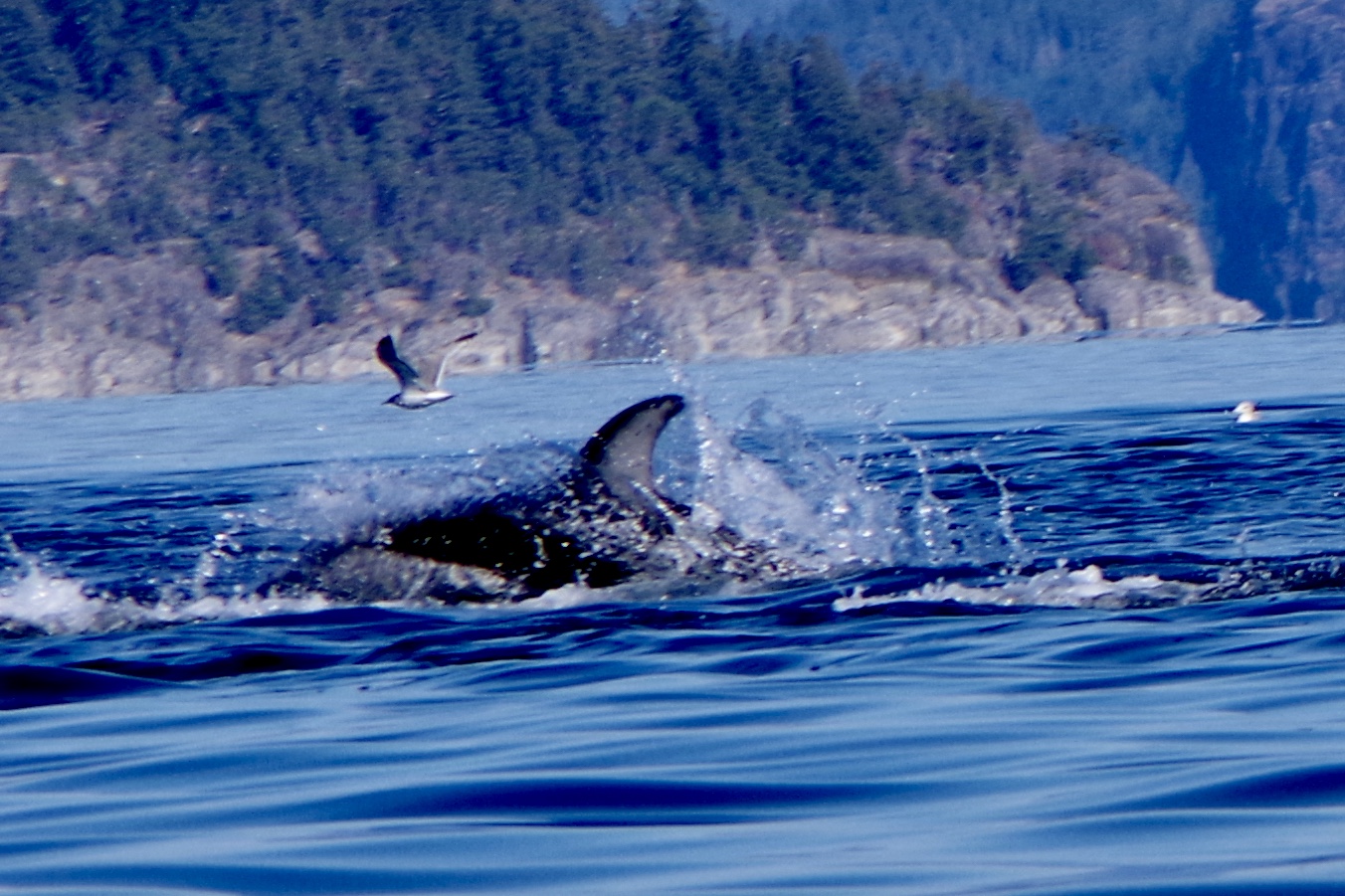 Orcas, Dolphins, Seals & Eagles oh my! We had noticed a seal or two as we were preparing to enter the water, they are very camera shy and difficult to get a good picture from the kayak, but as we made our way around the end of the spit, I was noticing a number of schools of fish, and fish normally mean seals, so we were hopeful. Laurie had seen a couple of dolphins from the ferry on our ten minute passage, but we had never experienced dolphins while in the kayak, well today we experienced a pod of nearly fifty, certainly an amazing experience. We tucked in to have some lunch, and were entertained by a seal just far enough to be out of a photos range but close enough to be seen swimming nearby, We then seen an Eagle attempt to catch a fish then landed in a nearby tree, then after turning around and heading back toward the end of the spit we seen a pod of Orcas, again well out of a camera shot, but I counted four huge dorsal fins out of the water at once. All and all an adventure for the books.