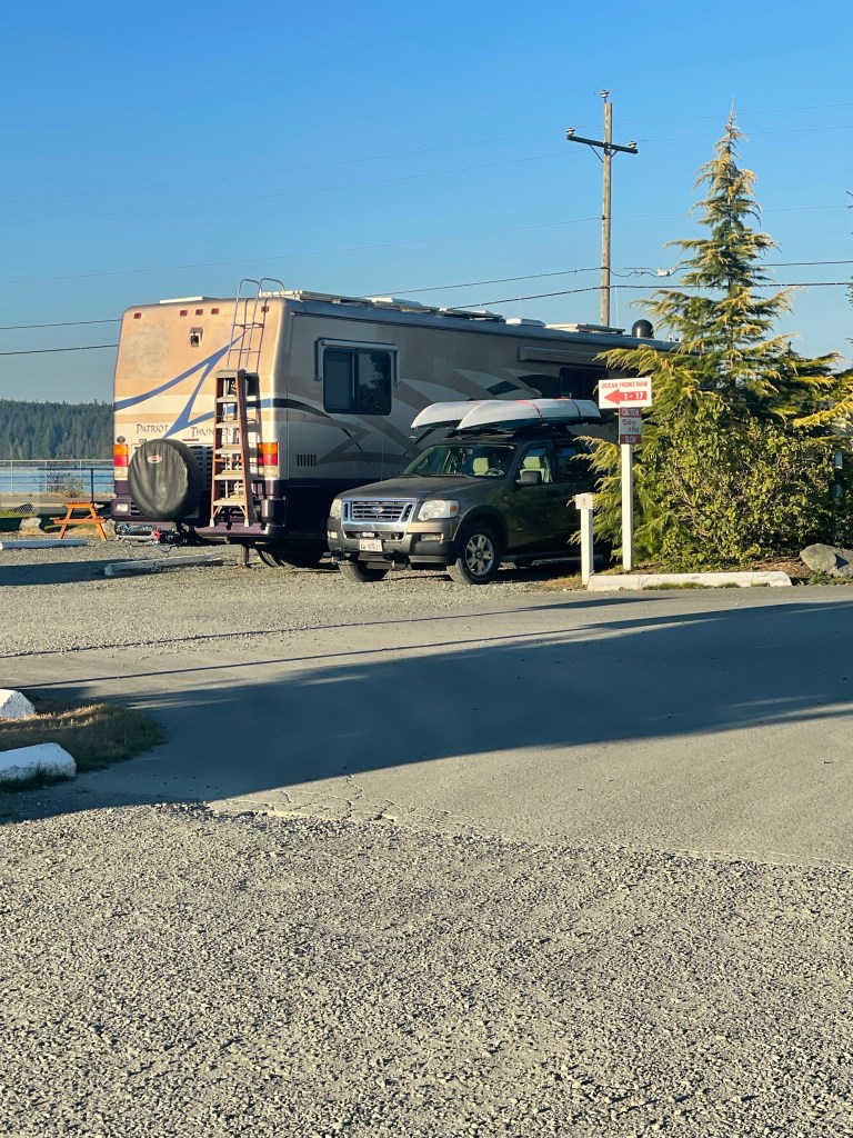 Saturday October 1st, 2022: I’m not sure why but I was up again at 3:00, so I sat and finished reading my book, and around at 4:30 as the lawn sprinklers we coming on, I headed back to bed, just to rise again at 7:00 but this time I was greeted by a beautiful sunrise, and a view of Salish Sea out of our windshield. As I sit here in the recliner looking out through the windshield at the Salish Sea (formerly the Georgia Strait), I’m thinking the late day drive was a good choice, but I do need to clean the windshield. Breakfast this morning was a cheese omelet, and of course there was some fresh perked coffee with a wee Irish Cream blessing, we are on vacation!