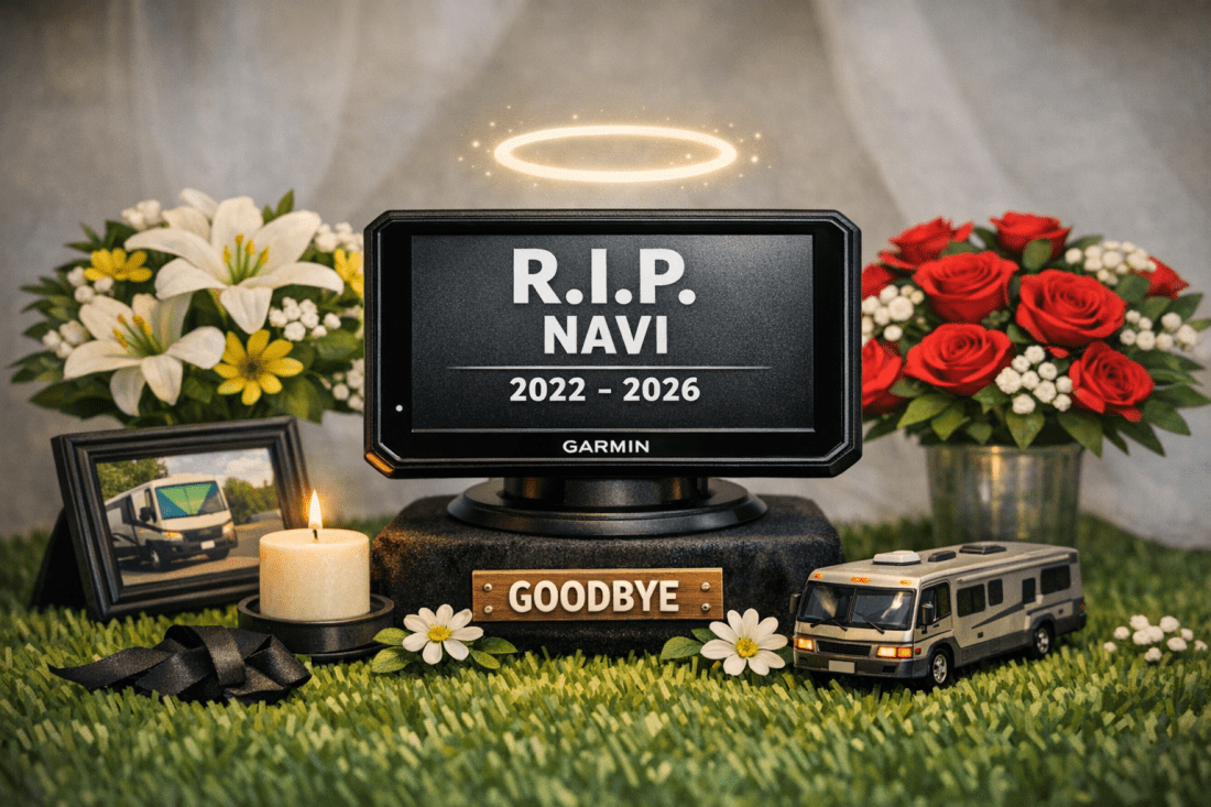 It is with a broken heart—and a slightly raised eyebrow—that I must announce that on March 6th, 2026, NAVI, our beloved Garmin RV GPS, passed away unexpectedly. This was the newest GPS I’ve ever purchased, which somehow makes the loss sting even more. I have ten‑year‑old units still operating like crusty old Marines, but the young one? Gone too soon.